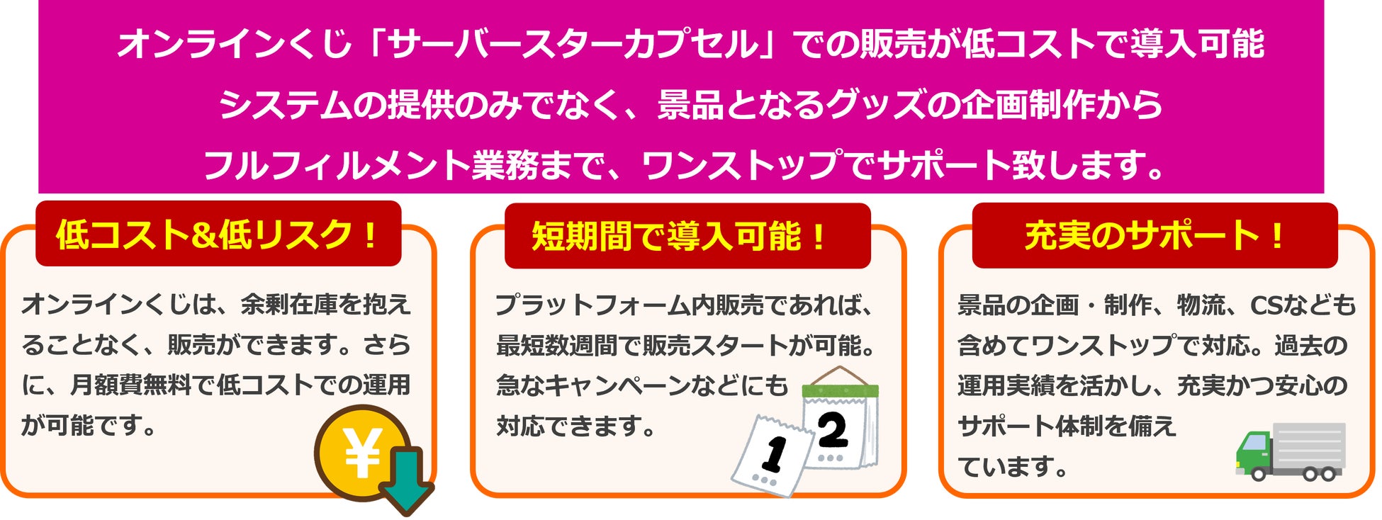 「サイバースターカプセル」は、実店舗や会場へ足を運ばずに、サイト内で購入したコインを消費し、オンライン上でカプセルを回して、その場で当選した景品を知ることができるといった、自らが商品を選択し購入する場合とは異なり抽選形式でしか味わえない独特の高揚感を感じることができるオンラインくじです。