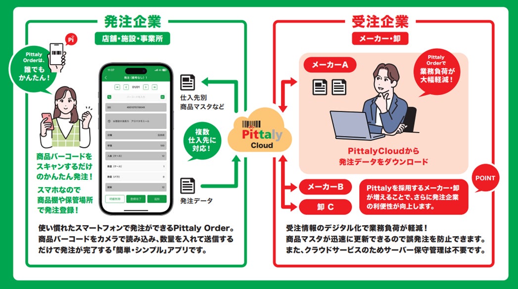 電話・FAXによるアナログ作業を必要とする受発注が依然として残っているという企業の声をヒントに開発を進め、受発注業務のデジタル化・ペーパーレス化を簡単に実現出来る「Pittaly Order」を2024年2月14日にリリースしました。Pittaly Orderは、発注業務をスマホアプリ、受注業務はクラウドサービスで提供しています。