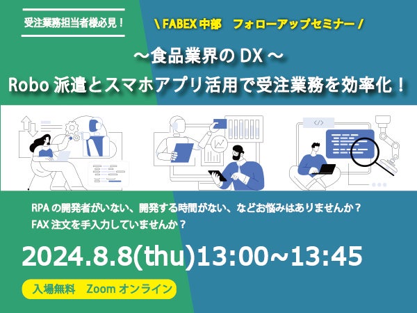 ユーザックシステム株式会社(本社:大阪市中央区、代表取締役社長:小ノ島 尚博)は、2024年8月8日(木)に食品業・受注担当者様向けに「【ファベックス中部フォローアップセミナー】~食品業界のDX~ Robo派遣とスマホアプリ活用で受注業務を効率化!」を開催することをお知らせいたします。7/24-25にファベックス中部2024にて、開発者,メンテナンス不要、初期費用0円(※)、1業務月々5,000円からご利用頂ける「Robo派遣」サービスと、スマホにインストールするだけでお取引先に発注出来る「Pittaly Order」を展示し、たくさんの方にご来場いただきました。そこで、会場ではお伝えし切れなかった食品業界の受注業務の課題や事例を交えた活用法、導入までの手順をセミナーで分かりやすく解説致します。また、8/22には同内容にてアーカイブ配信いたします。FAXを見ながら手作業で基幹システムに入力している企業様、定型作業を人手で行っている企業様には是非お聞き頂きたいセミナーです。[大崎1] オンライン開催で参加費無料、当日までWebからのお申し込みを受け付けています。ご参加をお待ちしております。