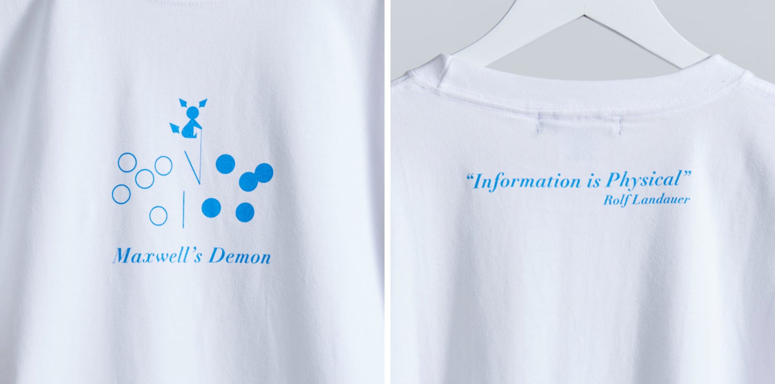 今回発売された"マクスウェルの悪魔" Tシャツは、情報熱力学の第一人者・東京大学教授 沙川貴大とQuizKnock 須貝駿貴監修のもと、もしも分子の動きを観察できる悪魔がいたら……という物理の思考実験「マクスウェルの悪魔」をモチーフに制作されました。首元のバックプリントには、物理学者ロルフ・ランダウアーの言葉、"Information is Physical"(「情報は物理的である」) が引かれています。
