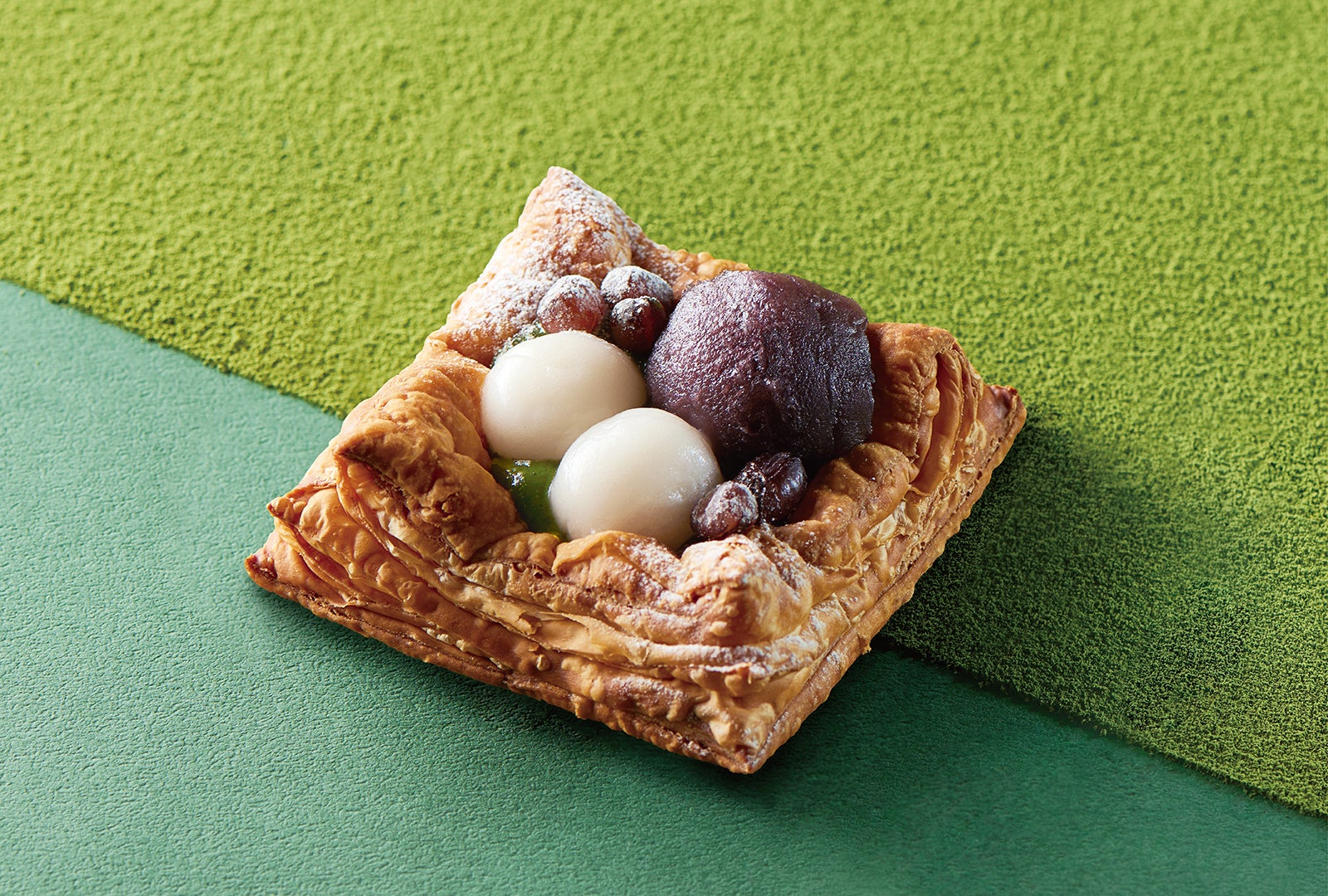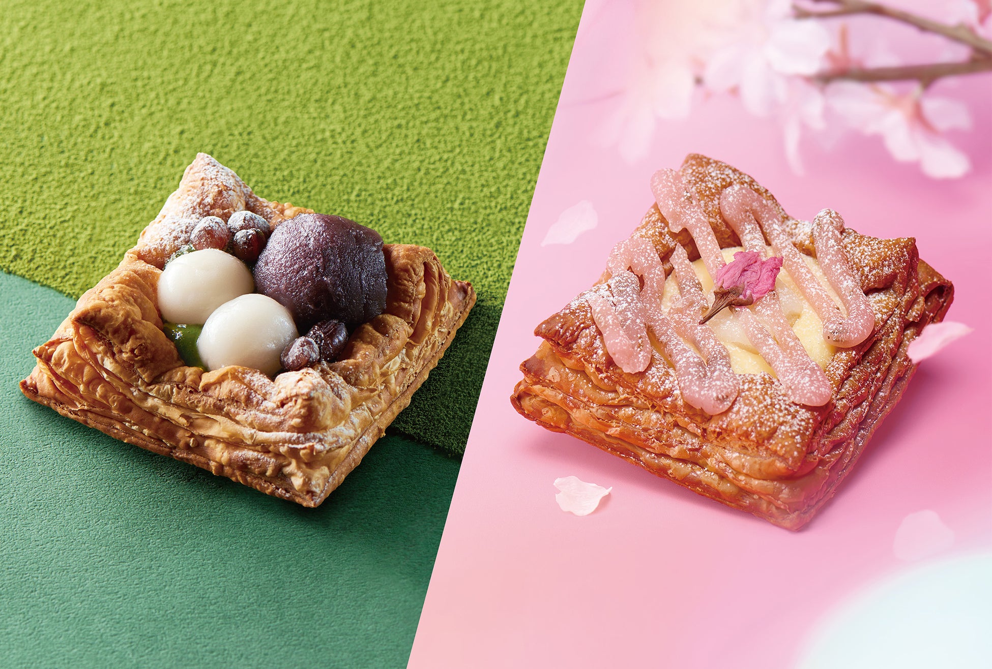 春の風物詩ともいえる「桜もち」と、和を代表する「抹茶」を贅沢に使用した2種類のオープンパイがこの春新登場!729層に重ねたサクサクなパイ生地とともに、一口ごとに春を味覚から満喫できる特別なスイーツが出来上がりました。