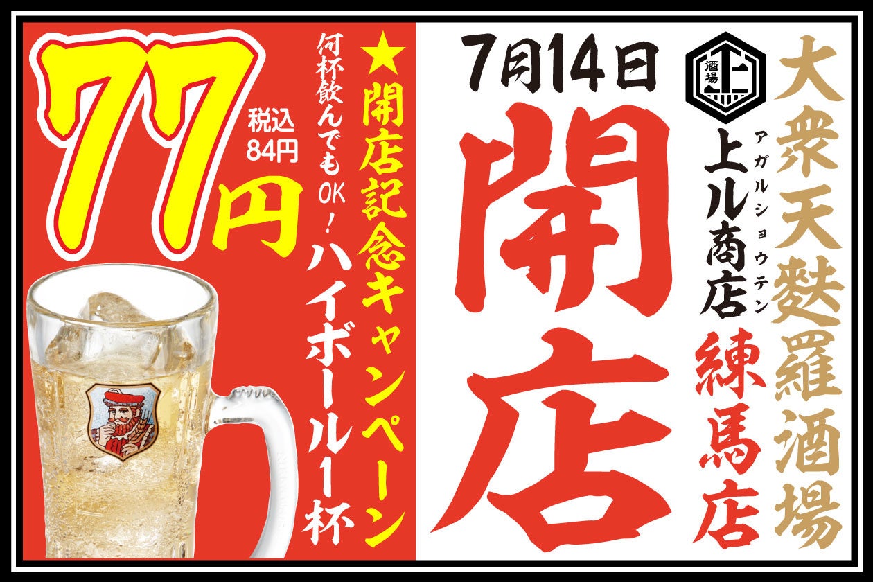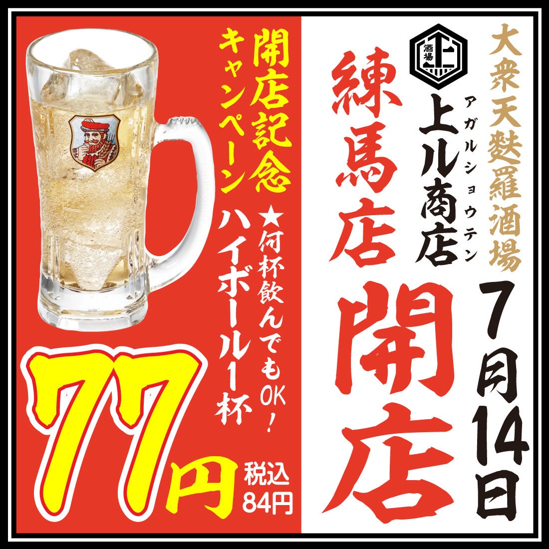 『天ぷら酒場 上ル商店 練馬店』の開店を記念して、ハイボールを何杯飲んでも1杯77円(税込84円)で提供いたします。<提供条件>