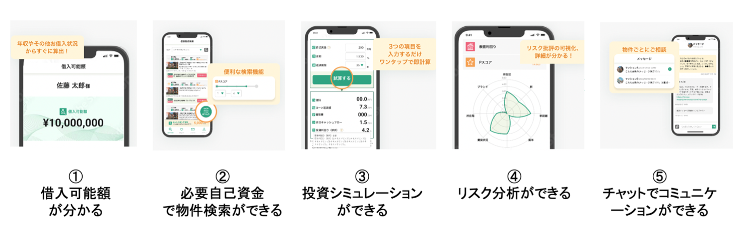 「INVASE Pro」は、まずユーザーが不動産投資ローンをいくらまで借りられるかという借入可能額の査定を行い、物件単位で投資に必要な自己資金の金額を算出します。これによりユーザーはアプリ上で自分が投資できる資金の範囲で物件を検索することができます。さらに物件ごとに投資利回りや月次キャッシュフローのシミュレーションができ、INVASE独自のリスク指標である「Pスコア」を使った投資リスクの把握も可能です。