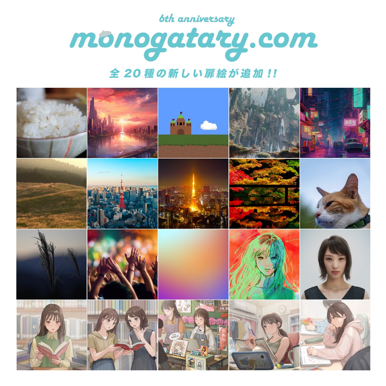 6周年を記念して、扉絵を追加しました!秋の彩りを感じるものから、ゲームのような世界観のもの、都会感全開のもの、そしてANNA&ゆずの扉絵も!さらに、この夏のモノコン2023「文藝 創刊90周年記念企画 鳴り響け、文学!文藝×monogatary.comコラボ賞」のキービジュアルとなった、藍にいなさんの描書き下ろしイラストも追加されました!この機会に、ぜひ新しい挿絵と共に執筆をお楽しみください。