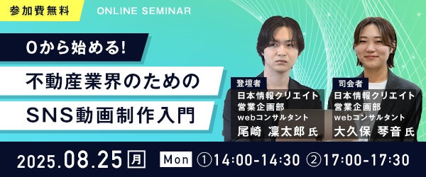 不動産テックを推進する日本情報クリエイト株式会社(本社:宮崎県都城市、代表取締役社長:辻村 都雄、証券コード:4054)は、2025年8月25日(月)に無料オンラインセミナー『0から始める!不動産業界のためのSNS動画制作入門』を開催することをお知らせいたします。