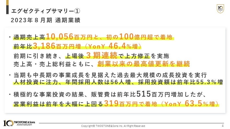 TWOSTONE&Sons 2023年8月期 通期決算を発表 通期売上高は初の100億円超(YonY46.4%増)、創業以来10期連続増収を達成
