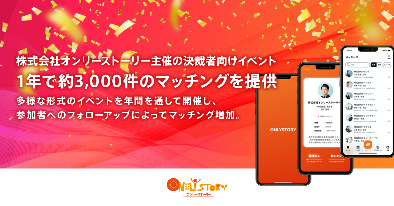 株式会社オンリーストーリー(代表取締役:平野哲也、本社:東京都渋谷区)は、運営する決裁者イベント(URL:https://only-story.jp/meetup/?_fsi=6L4XHNLp)経由でのマッチング数が、2020年12月から2021年11月までの1年間で約3,000件を記録しました。