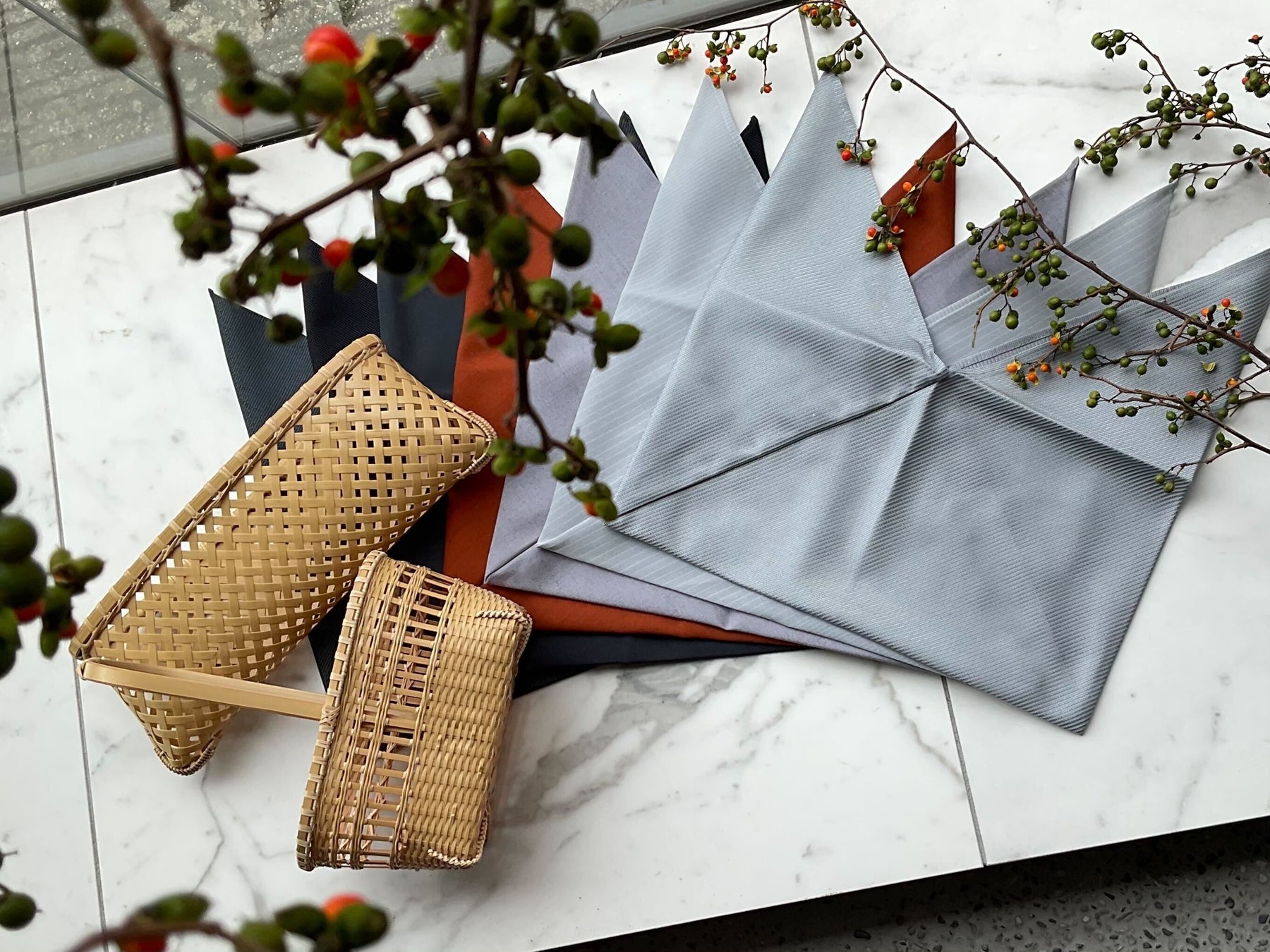 その中の2つ(Nuvola_Rectangle Bag、Clutch Bag)はBEPPU BAMBOO JAPANとTHE YARDのコラボレーションとして、THE YARDのきもの生地を使用したオリジナルのあずま袋がインナーバッグとして付属いたします。