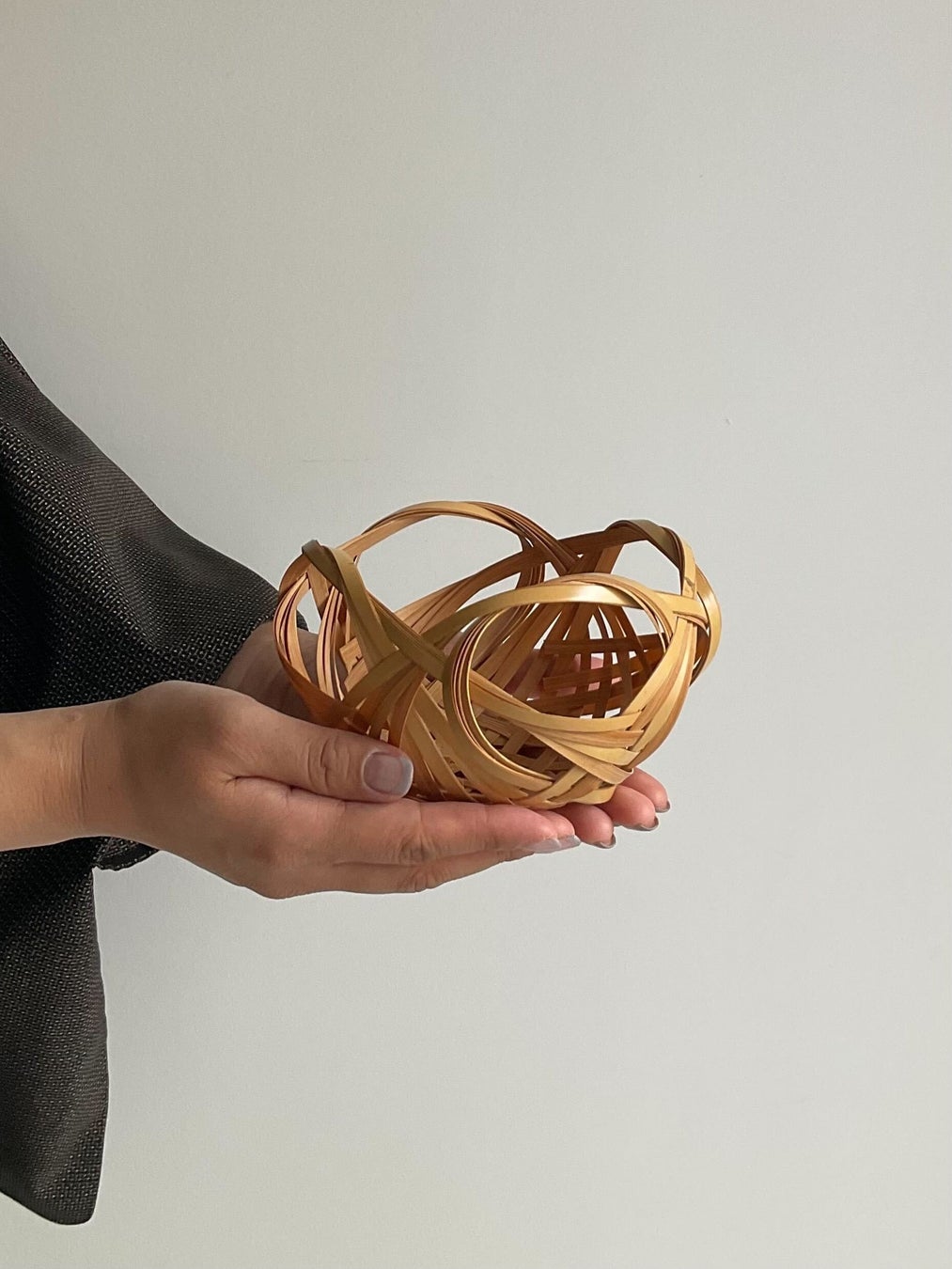 持ち手の繊細な曲線、籠の底部分のシャープな立ち上がり、淵の部分や小さな飾りの繊細なディテールは、素朴さに味わいを感じる従来の竹細工とは一線を画しています。