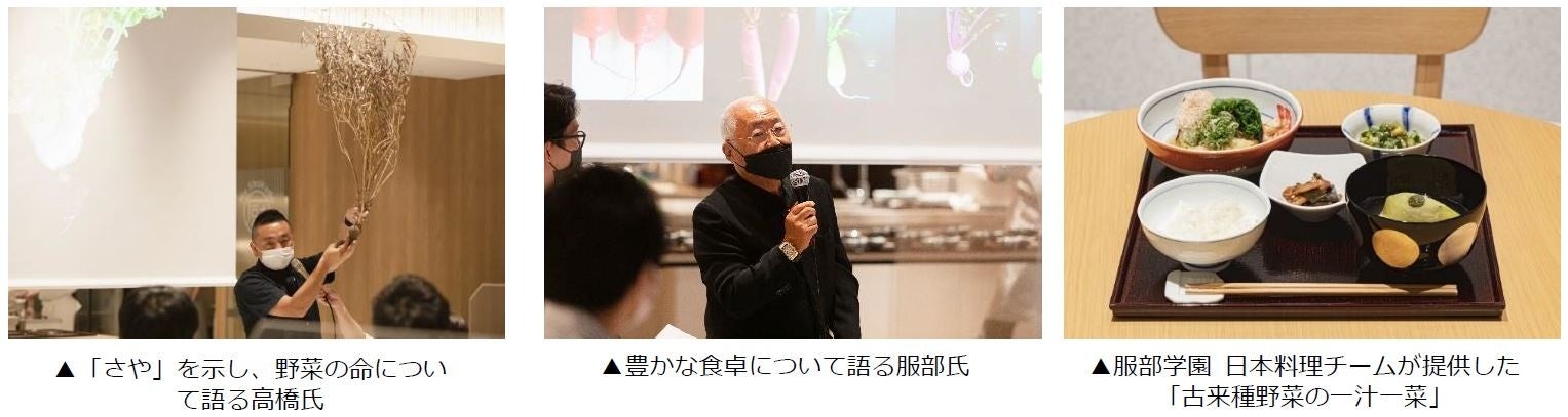 高橋氏より「生産性が低く効率が悪くても途絶えさせてはいけないものがある。効率性が重視される“農業”も重要だが、日本の風土と季節の移ろい、そして人を繋げる“農”を、古来種野菜を通して残していきたい。」との強い志が示されました。服部氏からは、「消費者の理解が深まれば、生産者はもっといいものを作れるし、それが手に入りやすくなる。古来種野菜や今日の学びを広げるお手伝いをしていただきたい。」とメッセージをいただき、自然とともに生きていく私たちが忘れてはならないことを学ぶ時間となりました。