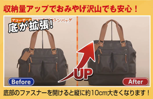 サイズ:ボストンバッグ:幅36(上部)・42(下部)×マチ25×高さ34(底マチ拡張時:42)cm