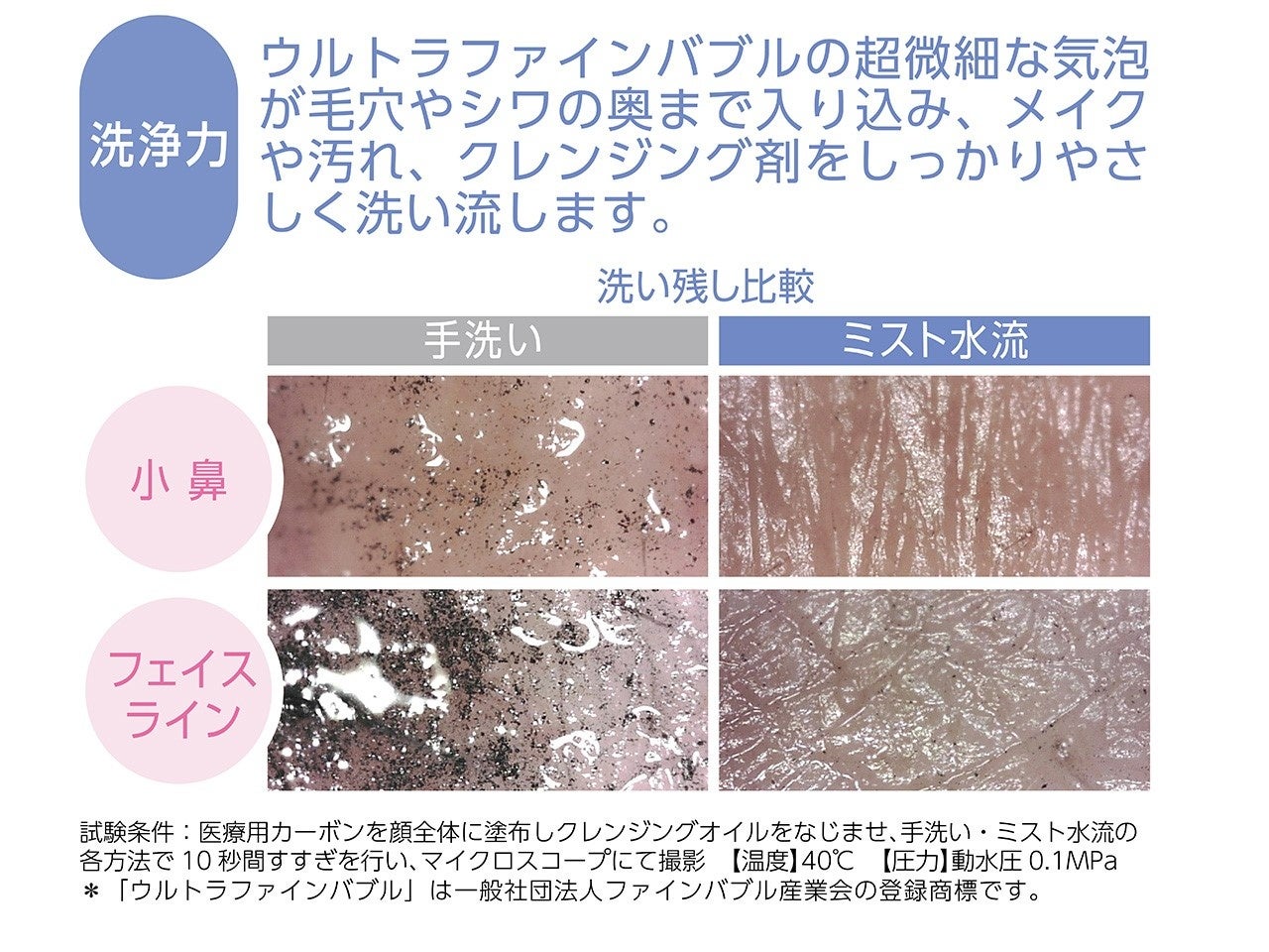 ・ミスト水流は、超微細な気泡が、毛穴やシワの奥まで入り込み、メイクや汚れ、クレンジング剤をしっかりやさしく洗い流す。