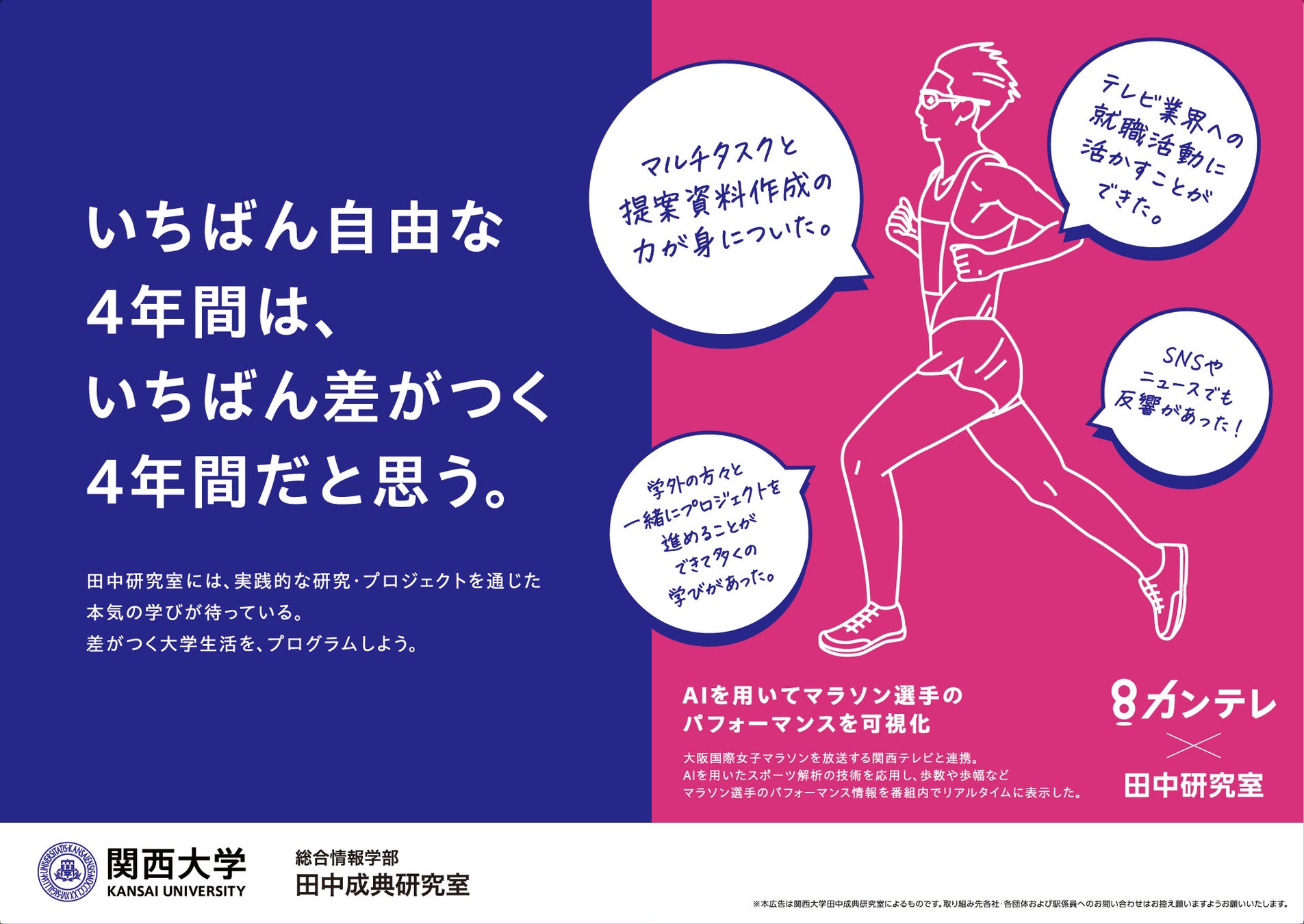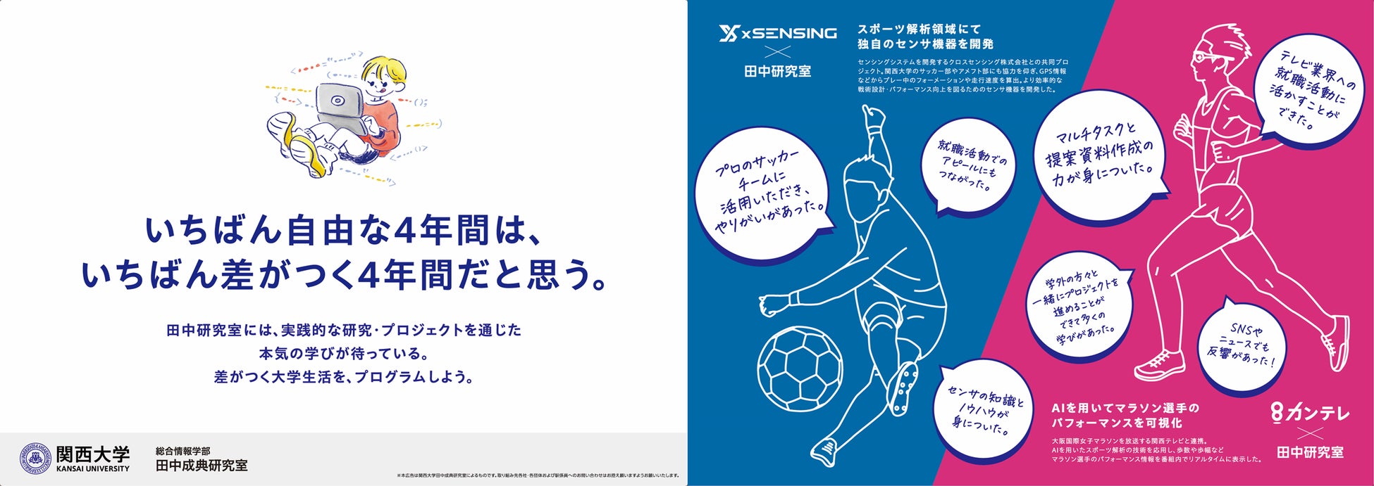 関西大学総合情報学部は,メディア情報と社会情報システム,コンピューティングの3の系から構成されている. 田中ゼミはコンピューティング系であるが,人文・社会・自然科学の分野を横断的に学んできた学生が多く在籍している.その中で,メディア系の知識を有する学生5名(4年生3名,3年生2名)に総合情報学部の活性化を目的とした広告制作プロジェクトの立ち上げを依頼した.リーダーの白崎さんを中心として,学生が感じている大学像や,大学生の在り方,高校生へのメッセージの視点から,社会連携活動(関西テレビ社とクロスセンシング社の取り組み)を軸として「大学って楽しいで !」を全面に出すような内容に仕上がった広告であると考えます.今後,関西大学総合情報学部と社会とが密に連携した社会活動成果を広告の媒体に載せることで,次世代の若者達が大いに刺激を受けて頂ければ幸いです.