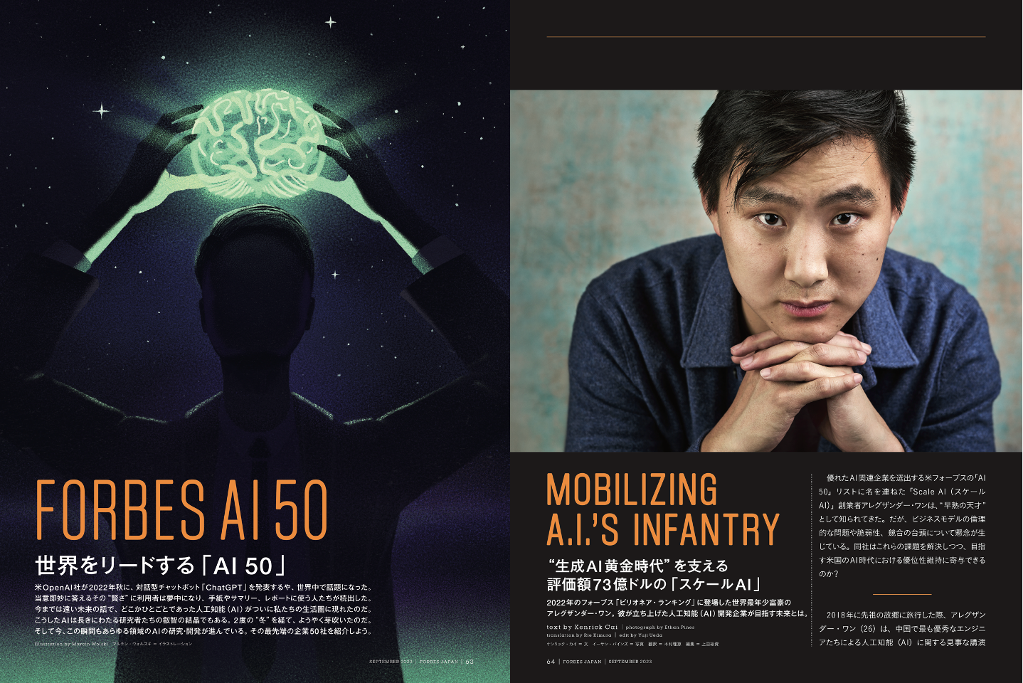 米フォーブスが選出する恒例のAIトップ企業リスト「AI 50」を発表! 2023年版は、世界を席 巻する話題の「ChatGPT」を開発した生成AI企業OpenAIのほか、動画生成AI企業 Midjourney、日本からはRevcommが選ばれています。また、50社の中からは「Scale AI」 をピックアップ。生成AI業界の競争激化に伴い、同社のビジネスモデルに対して懐疑的な 目も――。22年にForbes史上最年少ビリオネアに輝いたMIT中退の若き天才創業者アレグザンダー・ワンは、この危機をどう乗り越えるか? ぜひご一読いただければと思います。