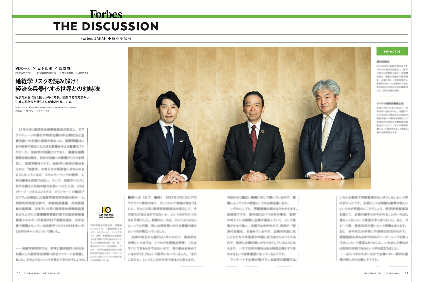 刻一刻と変化する国際情勢とビジネス環境の変化のなかで、地政学に経済の視点を入れた「地経学」の考え方が経営者に必須のスキルとなってきた。地経学研究所所長で東京大学教授の鈴木一人、同研究所経営主幹で共創経営基盤・共同経営者の塩野誠、日本企業でいち早く経済安全保障統括室を立ち上げた三菱電機常務執行役で元経済産業省資源エネルギー庁長官の日下部聡の3人が集まり、地経学リスクに対応する日本企業の現状と三菱電機の事例、日本の今後の展望について語った。