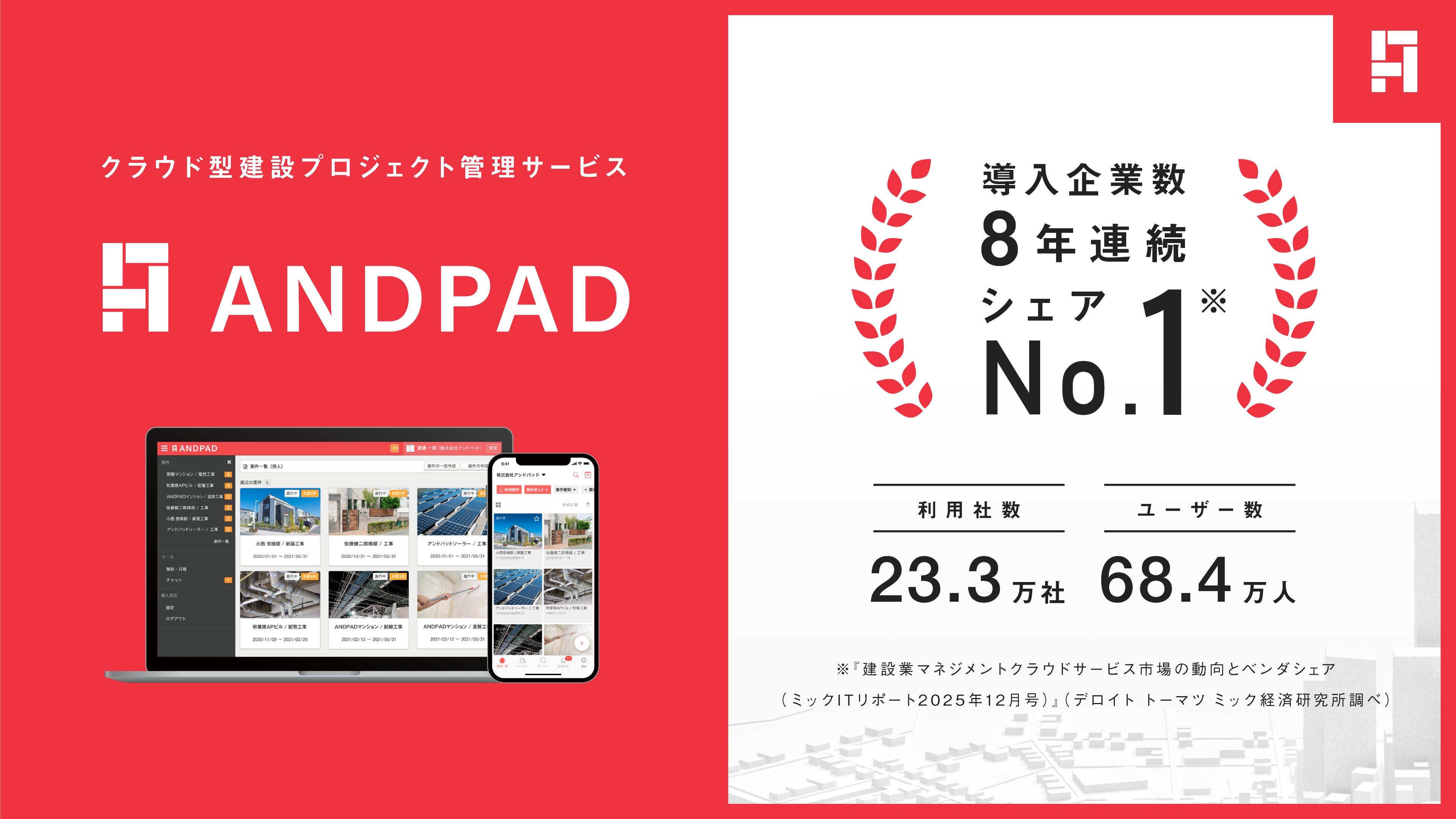 株式会社アンドパッド(本社:東京都港区、代表取締役:稲田武夫、以下アンドパッド)が提供するクラウド型建設プロジェクト管理サービス「ANDPAD」は、「建設業マネジメントクラウドサービス市場の動向とベンダシェア」調査※において、導入企業数8年連続シェアNo.1を獲得しました。