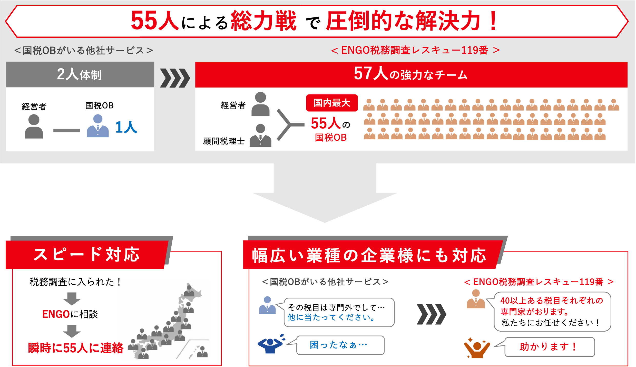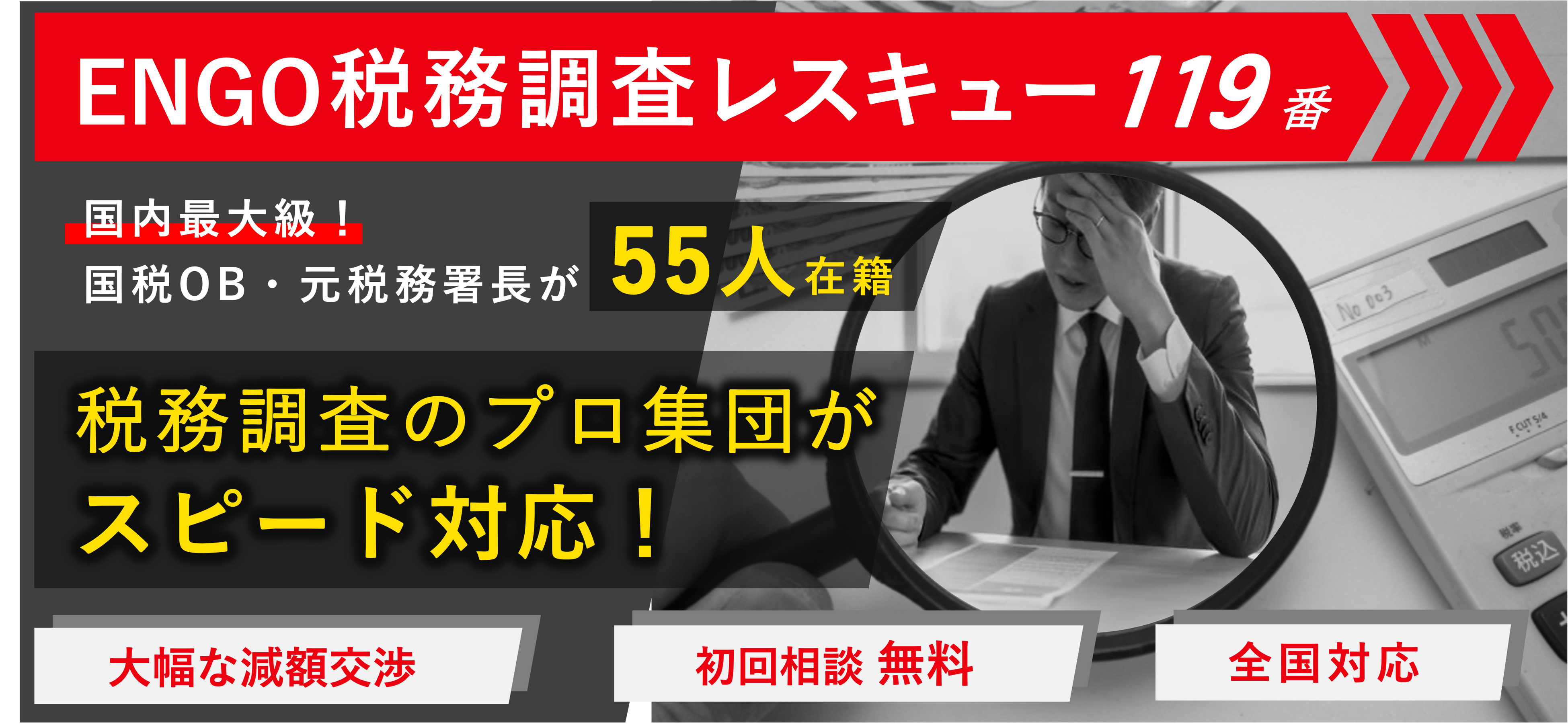 【税務調査の緊急立会い-全国対応-】国内最大級「55人の国税OBチーム」がスピード対応!『ENGO税務調査レスキュー119番』のサービスを開始いたしました。初回相談 無料!