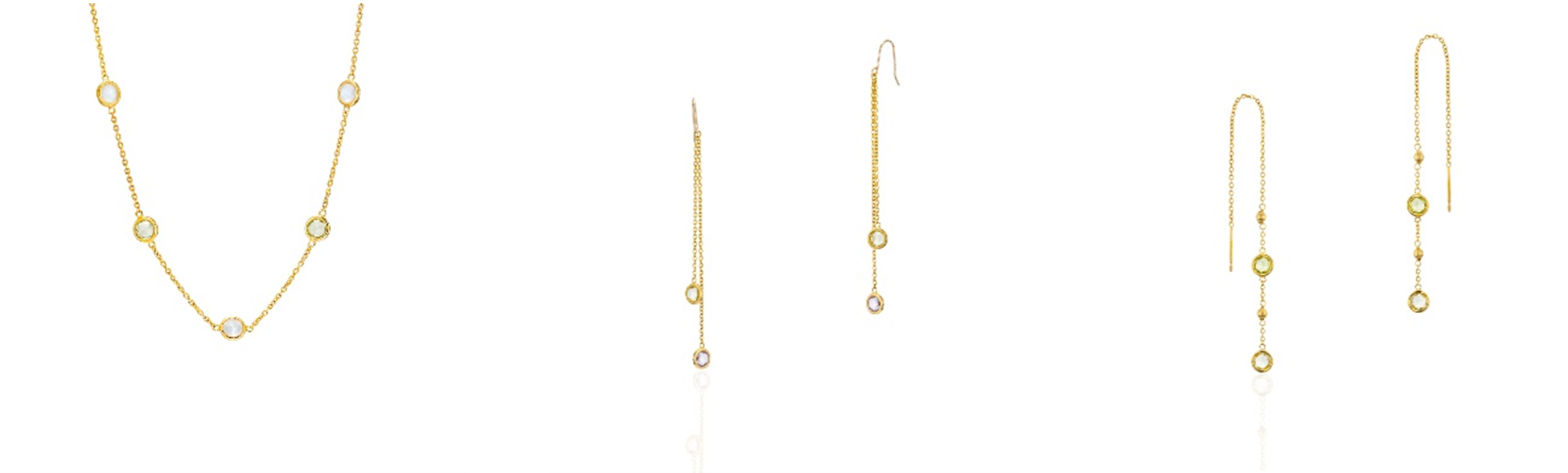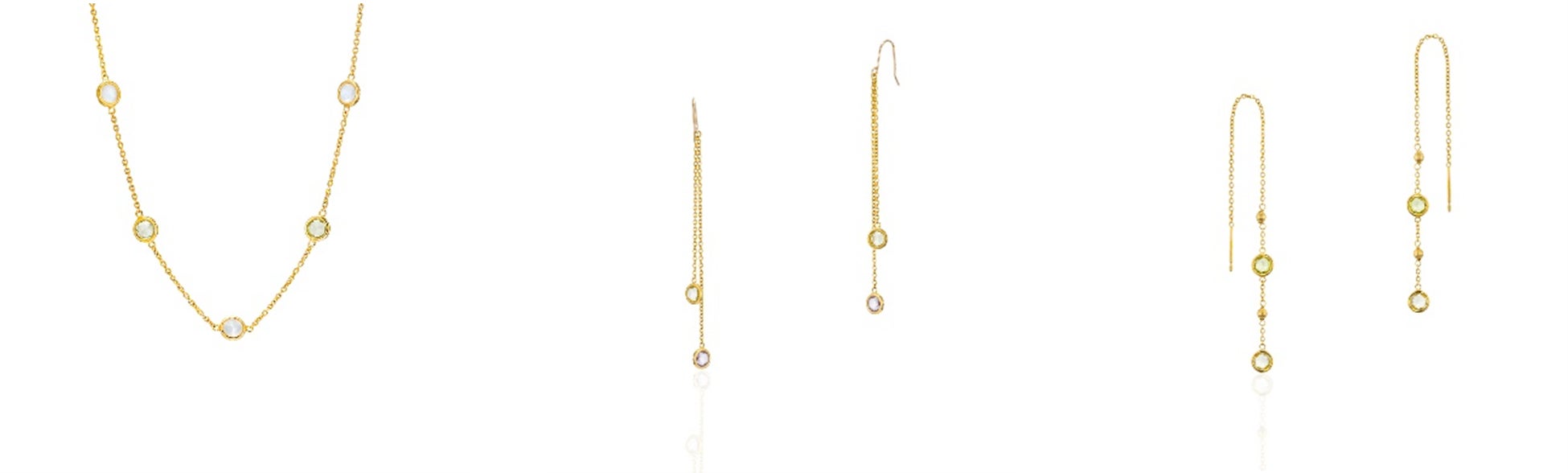 爽やかなレモンクォーツに、それぞれムーンストーン、ピンクアメシスト、ペリドットを組み合わせたデザイン。それぞれのストーンの優しい色合いが肌を照らし、柔らかくたおやかな印象に。60cmのロングネックレスは、シンプルなモチーフのネックレスとレイヤードして、より奥行きのあるコーディネートを楽しむことができます。またカラーストーンが耳元で揺れ動くロングピアスは、アップスタイルのヘアに合わせて主役にしたり、お好みのイヤーカフと合わせたり、コーディネートを選ばず身に着けられるデザインです。