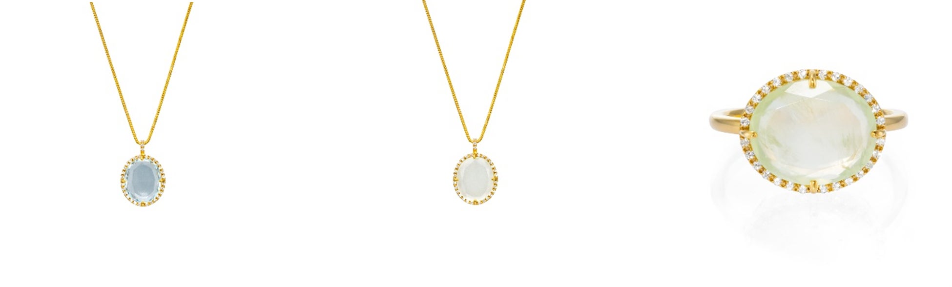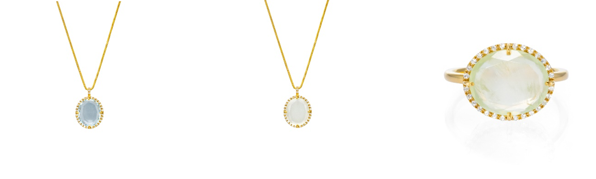 つややかなカボションカットのカラーストーンをあしらったネックレスは、シンプルだからこそ天然石の美しさが目を惹くエレガントなデザイン。同じくカボションカットのカラーストーンをセッティングしたリングは、指先で存在感を持って輝き、目に入るたびに気分を上げてくれます。3色のカラーから自分らしい輝きを見つけて。