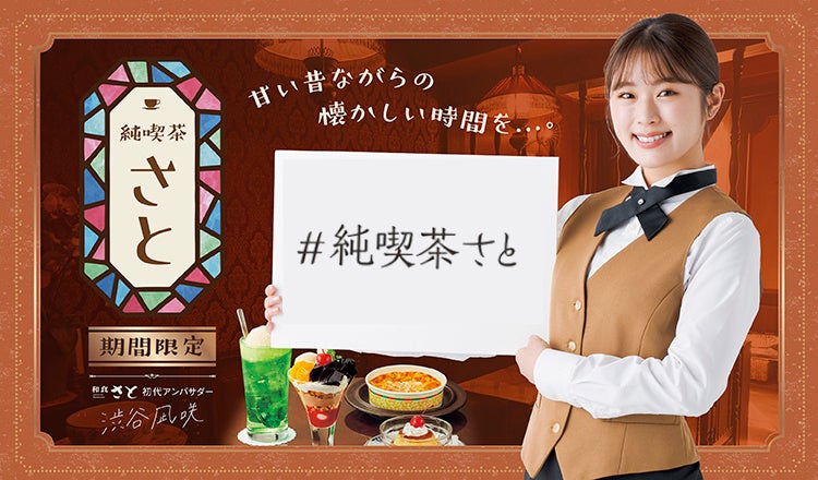 和食さとと渋谷凪咲さんのコラボ企画「純喫茶さと」の昔懐かしいデザートで、思い出話に花を咲かせたり写真を撮ったりなど、是非、和食さとのお店で楽しいひとときをお過ごしください。