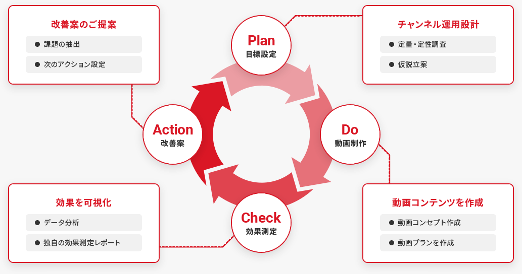 主に「Youtubeの既存の投稿動画を活用する」場合と、「Tiktok、YouTube Shorts用に短尺動画を新規作成する場合に分けて、コミュニケーションプラン策定から、運用、改善をすることでTiktok、YouTube Shortsの効果を最大化します。