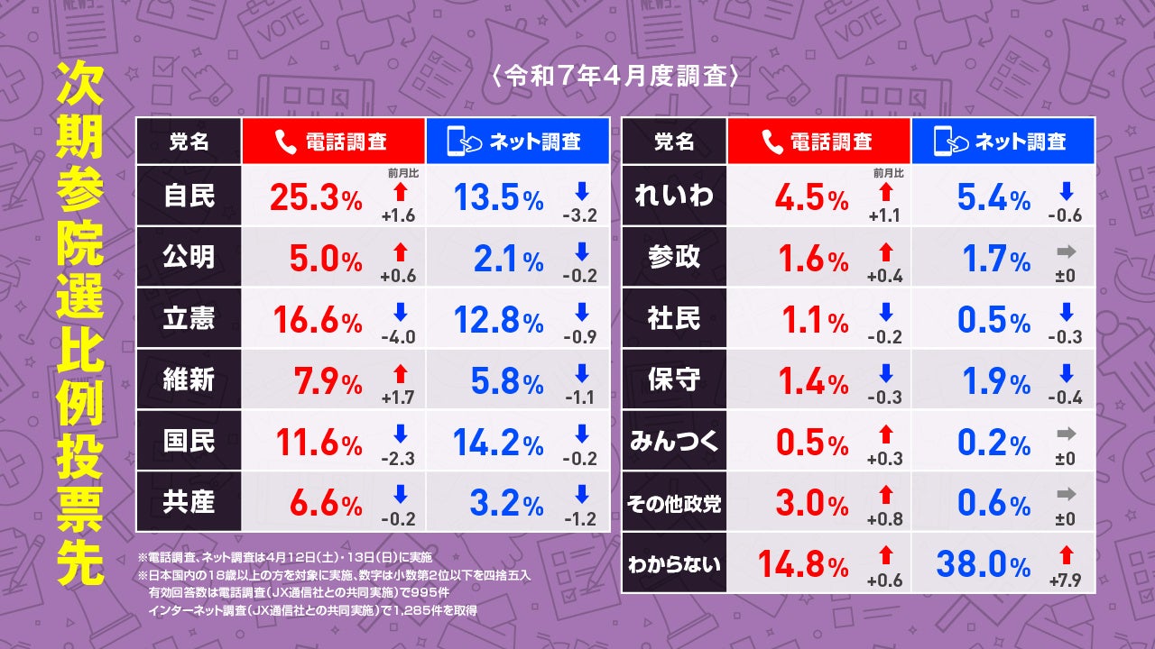 国民民主党がネット比例投票先で首位!内閣支持率は下げ止まり!2025年4月実施 電話&ネットのハイブリッド意識調査結果を発表【選挙ドットコム×JX通信社】