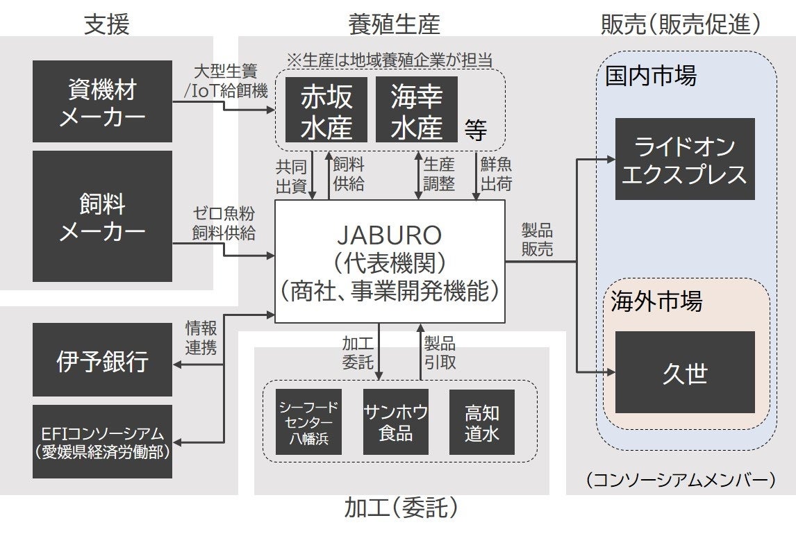 本事業は、愛媛県西予市三瓶地区の真鯛養殖企業3社が出資したJABUROが主体となり、魚粉を一切使用せず植物性タンパク質を原料とした餌で育成した完全養殖真鯛”サステナブル真鯛”の生産・販売を通じて、販路拡大や地域ブランド化、雇用創出等のシナジー効果を発揮し、真鯛養殖の成長産業化を共創する取組みを行うものです。