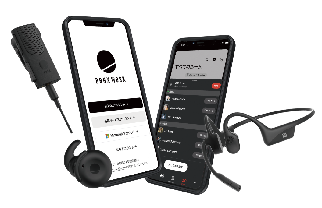 現場コミュニケーションのワンストップソリューション「BONX WORK」。1人1台のスマートフォンとイヤフォンさえあれば、グループトークや文字起こしなど、デスクレスワーカーの生産性を高める多彩な機能を即座に利用可能です。