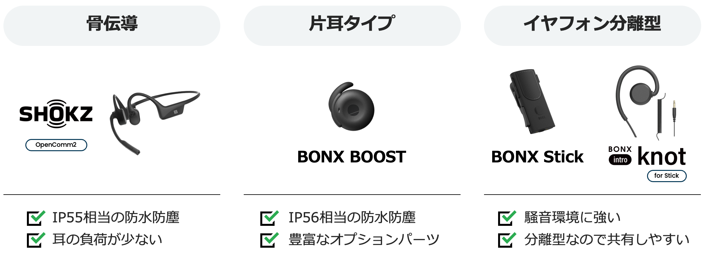入浴介助中でも安心な防水性能(IP56)を備えたモデルや、長時間のシフトでも快適な軽量・ロングバッテリーモデルなど、現場のニーズに合わせたデバイス選択が可能です。現場の声を形にしてきたBONXならではの高精度な集音性能により、騒音下でも「あなたの声」だけをクリアに抽出し、安定した音声記録を実現します。