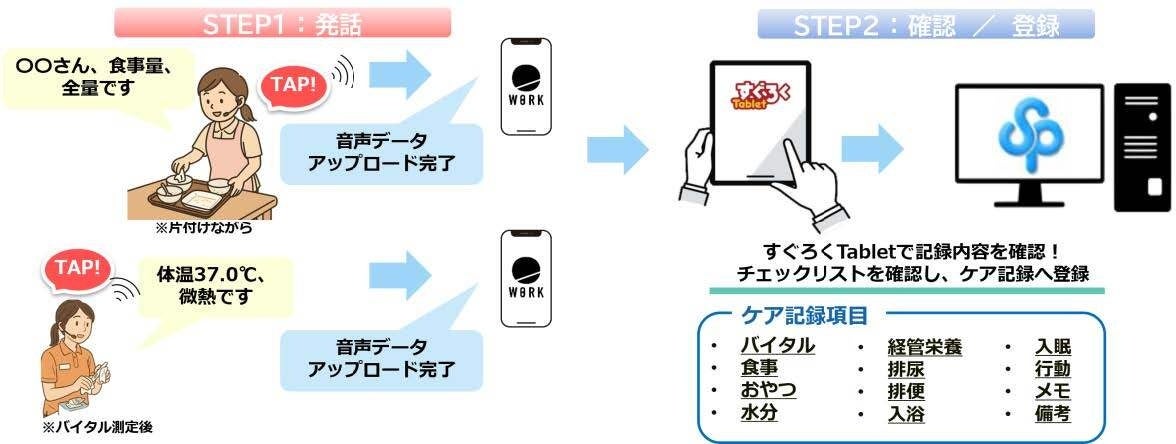 操作の流れは大きく分けて2ステップ。はじめにBONXデバイスを操作してケアの内容を発話します。続いて「すぐろく Tablet」のチェックリストで内容を確認して、転記ボタンを押すことでケア記録の登録が完了します。
