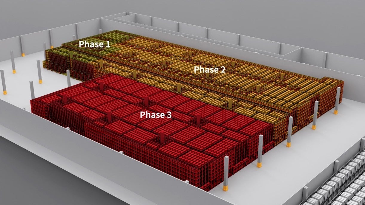 大正センターでは、大規模倉庫で日々のオペレーションを継続しながら、Phase1~3の3段階に分けてラピュタASRSを導入。