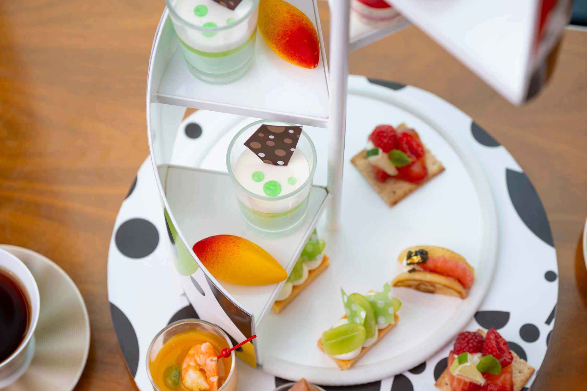 レトロポップなドット柄スタンドでご提供するのは、スイカ、マンゴー、メロン、シャインマスカット、フランボワーズの5種のサマーフルーツを取り入れたスイーツ5種とセイボリー5種、計10種のメニュー。見た目にも華やかな、ドット柄の世界観を楽しめるアフタヌーンティーです。エレガントにもキュートにも楽しめるドット柄アフタヌーンティー。ぜひ、ドット柄のアイテムを身に着けてご参加ください。