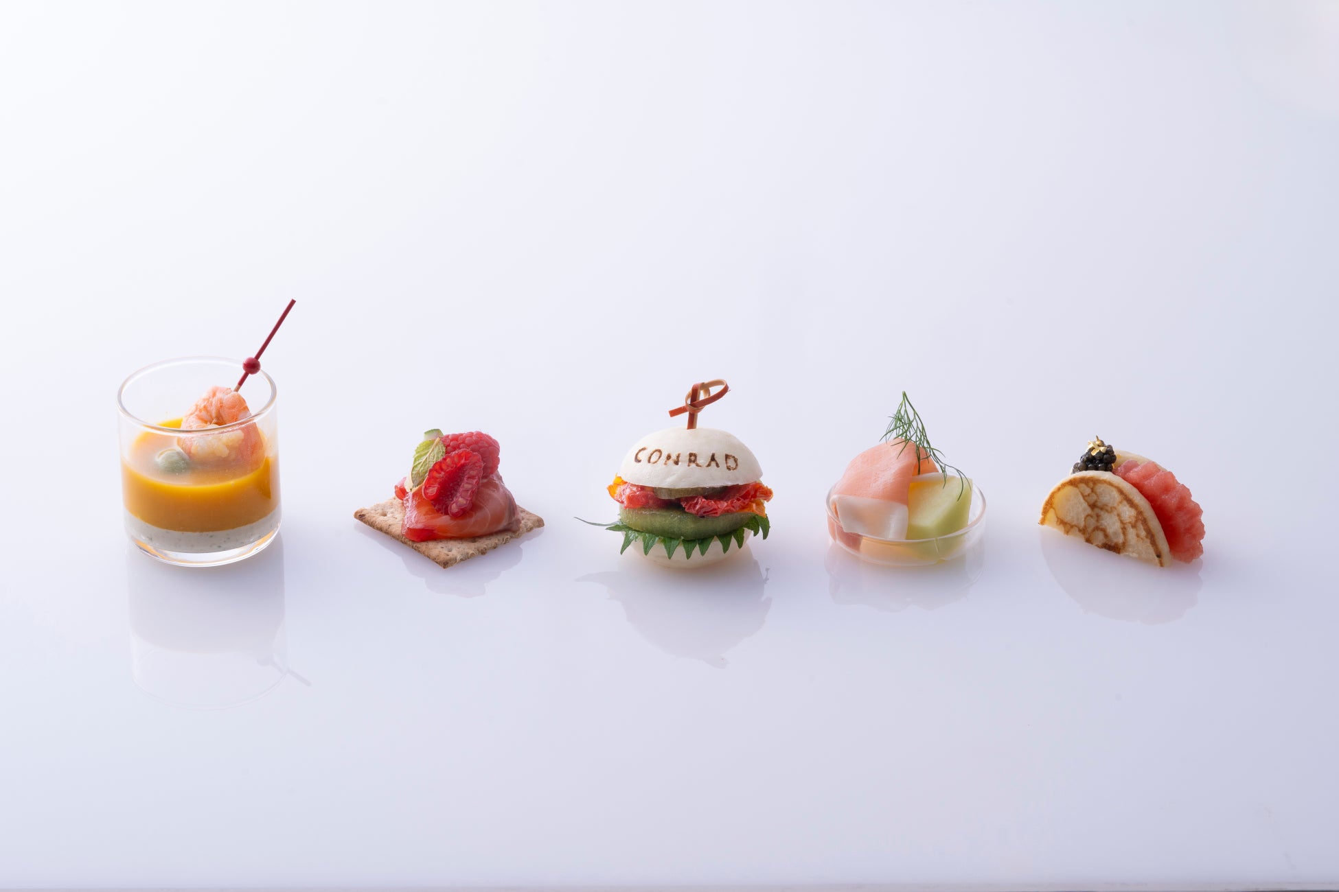 セイボリーには、鮮やかなオレンジ色が特徴のシーベリーとマンゴーを合わせたスープに、グリーンオリーブと海老をあしらった「マンゴーとシーベリーのスムージー」、ビーツでマリネしたサーモンにライムクリームとフランボワーズの酸味をプラスした「フランボワーズとビーツのサーモンクラッカー」、フェタチーズ、ヨーグルト、大葉、キウイ、ドライトマトの層に、メキシコ原産きゅうりのガーキンピクルスを挟んだ可愛らしいミニバーガー「キウイとセミドライトマトのスライダー」、イタリアンの前菜の定番である生ハムとメロンに相性抜群のマスカルポーネチーズを添えた「生ハムとメロン」、さらに夏の代名詞スイカを一口サイズのパンケーキ、ブリニでサンドし、キャビアとサワークリームを添えた「フランス アキテーヌ産キャビアとブリニ」もご用意しました。