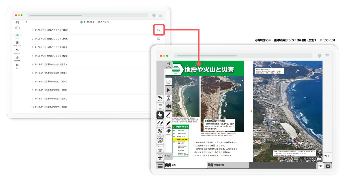キュビナの問題画面に表示された教科書のアイコンをタップすることで、対応するデジタル教科書の該当ページにジャンプし、教科書で学習することができます。一つひとつの問題だけではなく、単元単位、より細かい小単元ごと、さらに細かい問題グループごとに、デジタル教科書へ連携しています。