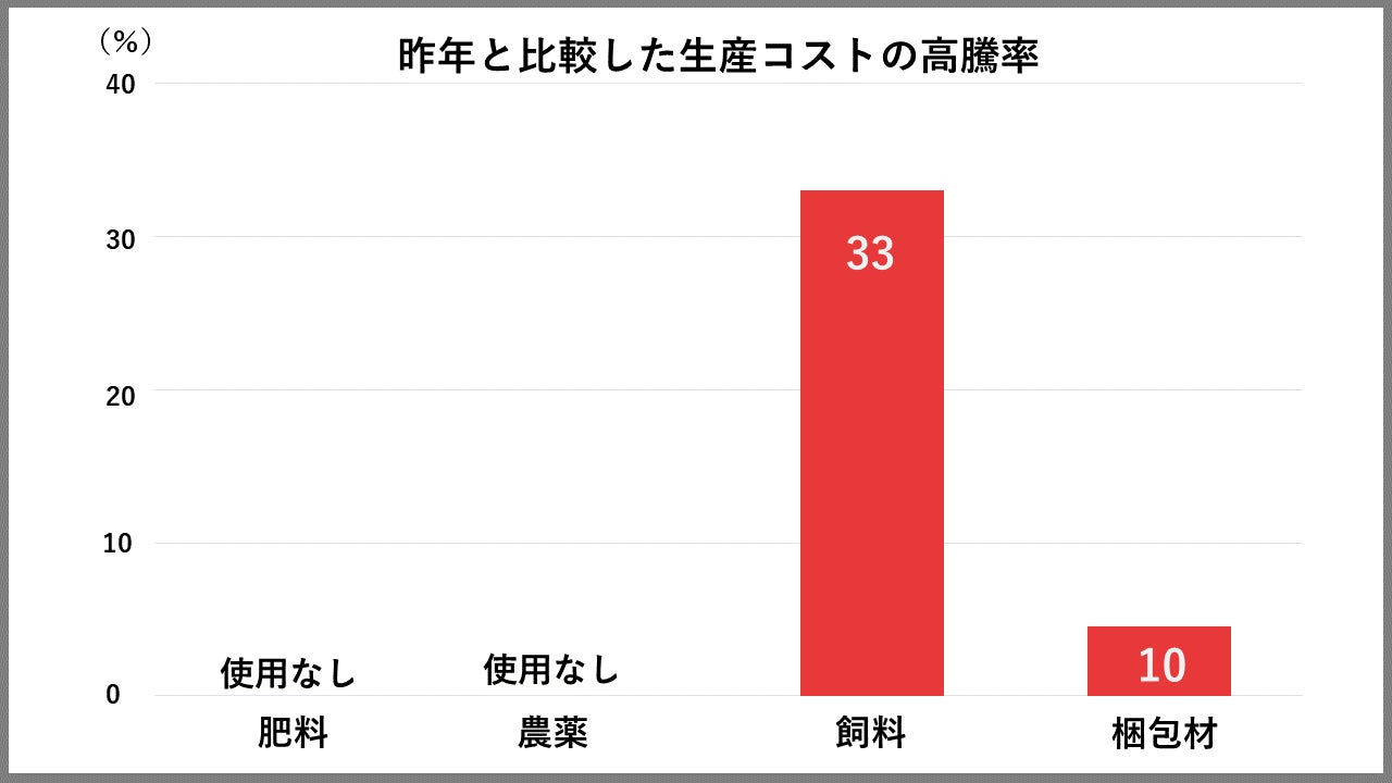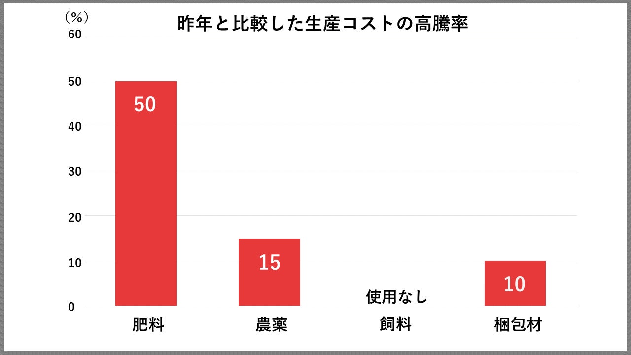 肥料:昨年比15~50% 農薬:昨年比15% 梱包材:昨年比10%