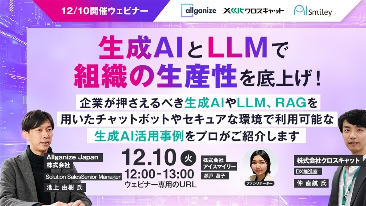 今回そうしたサービス提供をする中で培ってきた知見を活かし、Allganize Japan株式会社様とともに、Aismiley主催のウェビナーに登壇し、「生成AIとLLMで組織の生産性を底上げ!」をテーマに、企業が押さえるべき生成AIやLLM、RAGを用いたチャットボットやセキュアな環境で利用可能な生成AI活用事例をご紹介しますので、ぜひご参加ください。