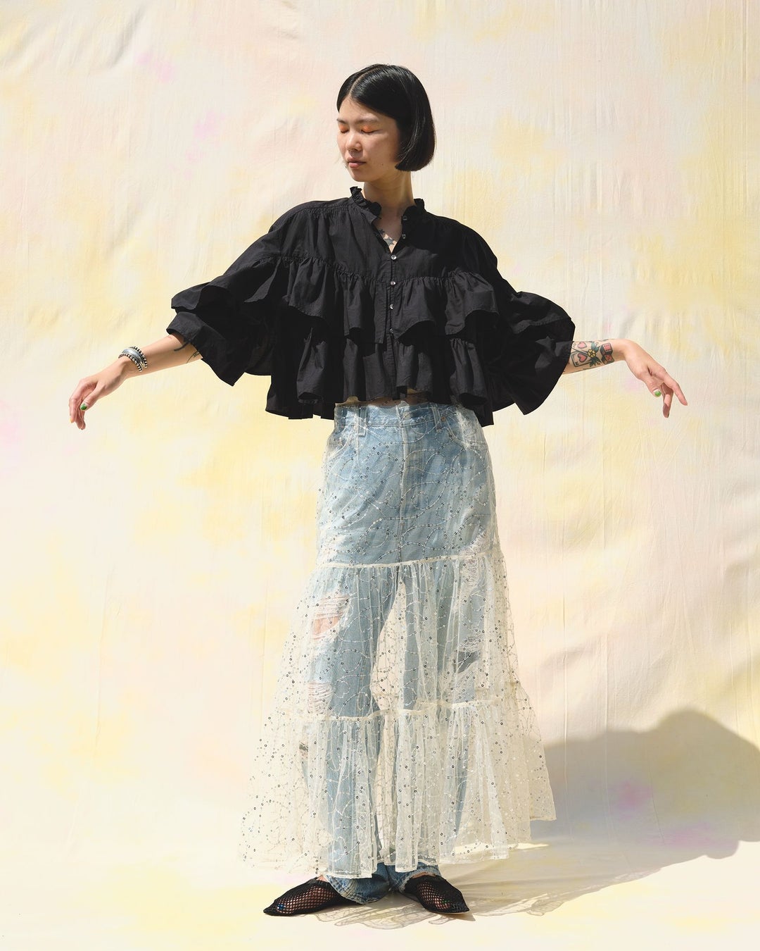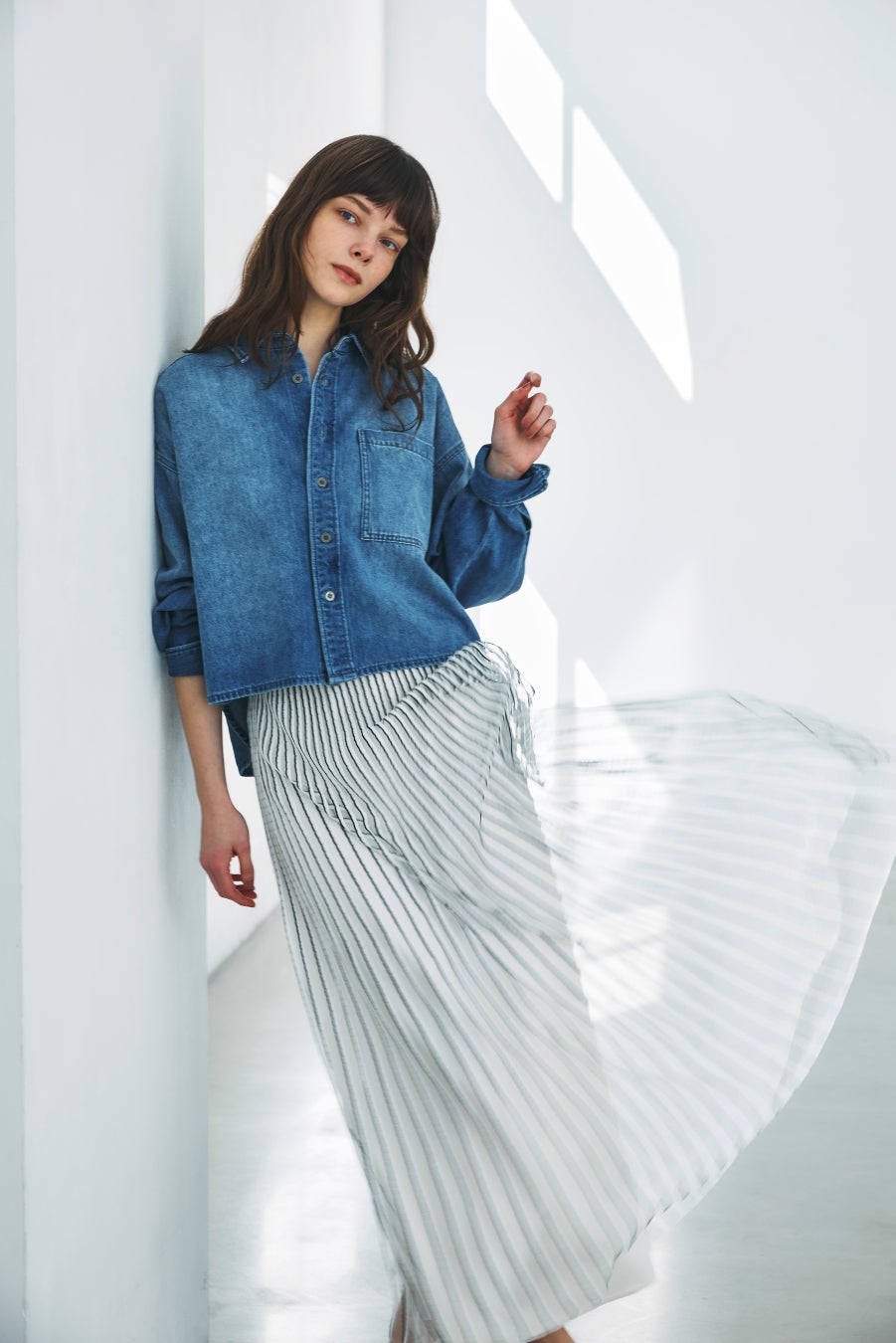この春は引き続きデニムトレンドに注目。カーヴィシルエットに拘ったポケット口や裾にさりげなく入れたダメージが特徴。デニムオンデニムのスタイルにも好バランスで、チャレンジしてみたくなる1枚です