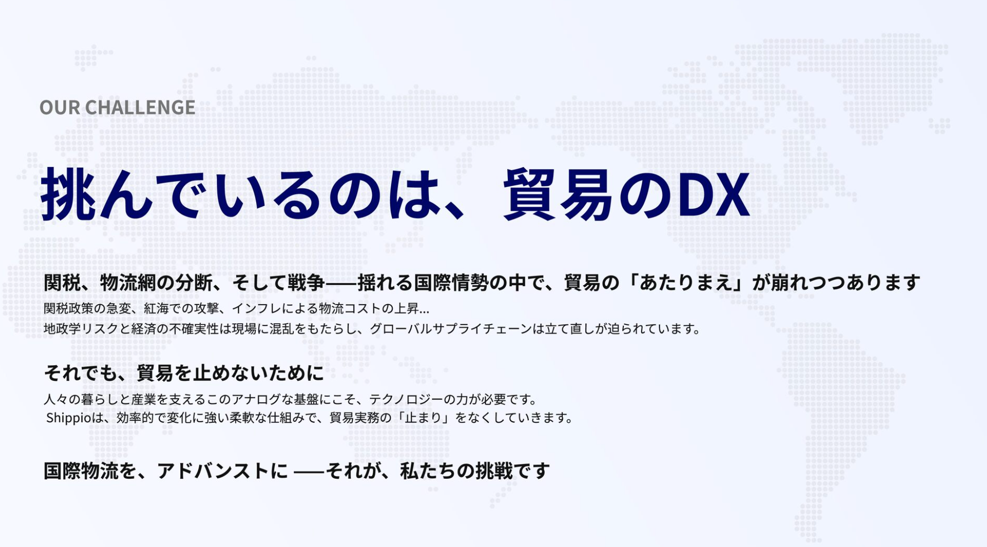 サプライチェーンを取り巻く状況が目まぐるしく変化し不確実性が高まる中、Shippioは日本の産業と経済を根底から支える貿易プラットフォームを構築し、企業の競争力維持に貢献して参ります。