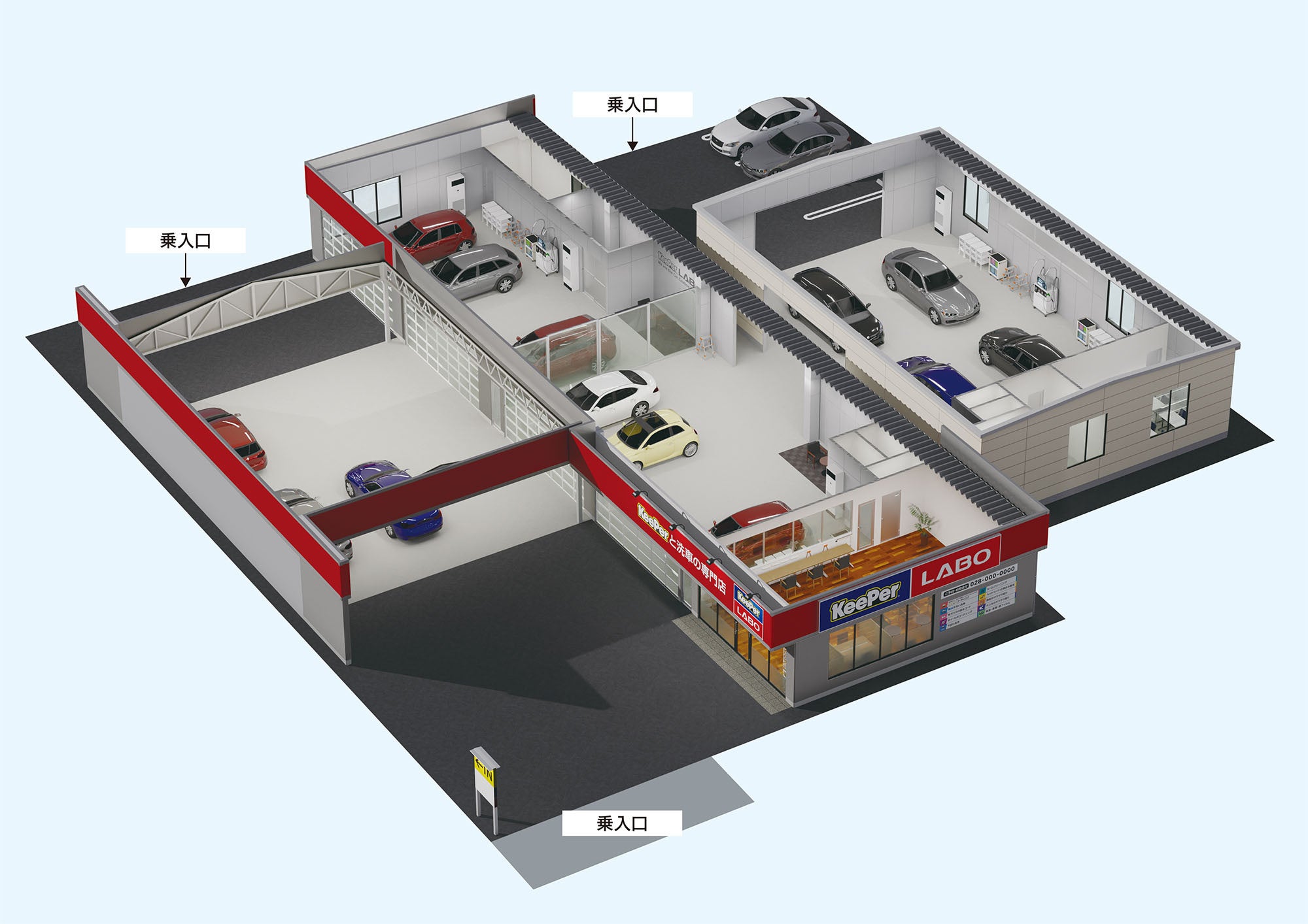 そして、作業を見ながら、ゆっくりお待ちいただける広いゲストルームと、コーティングブース内にもお客様と 一緒に車両を見ながら受付のできるテラス席を2か所設けた店舗で、北関東のキーパープロショップ及びカーディーラーへの技術トレーニングとサポート拠点としての役割を担う大型店舗です。