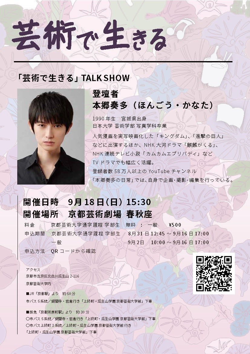 - 企画1:本郷奏多さんトークショー「芸術で生きる」9/18(日)