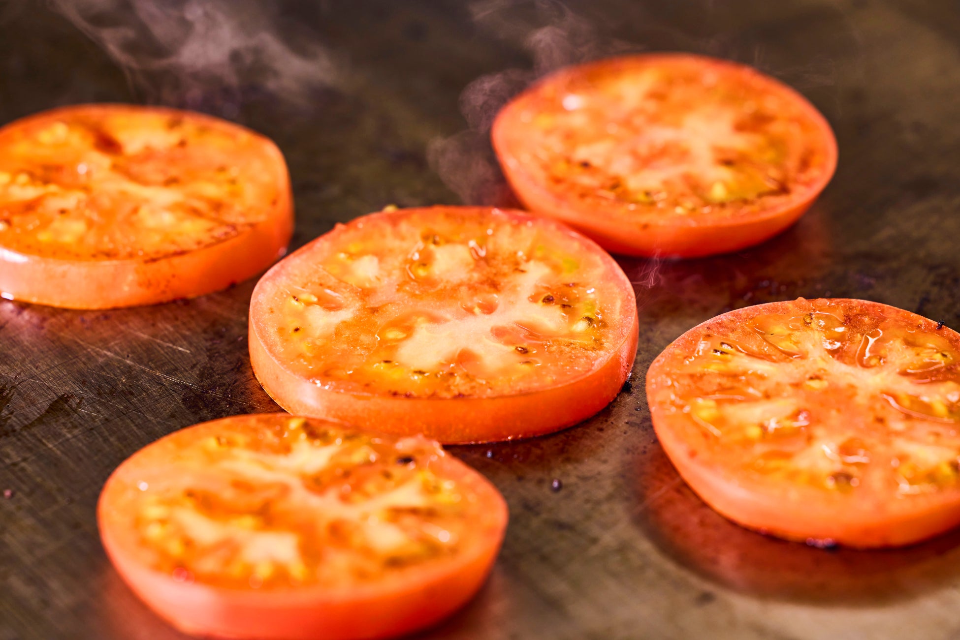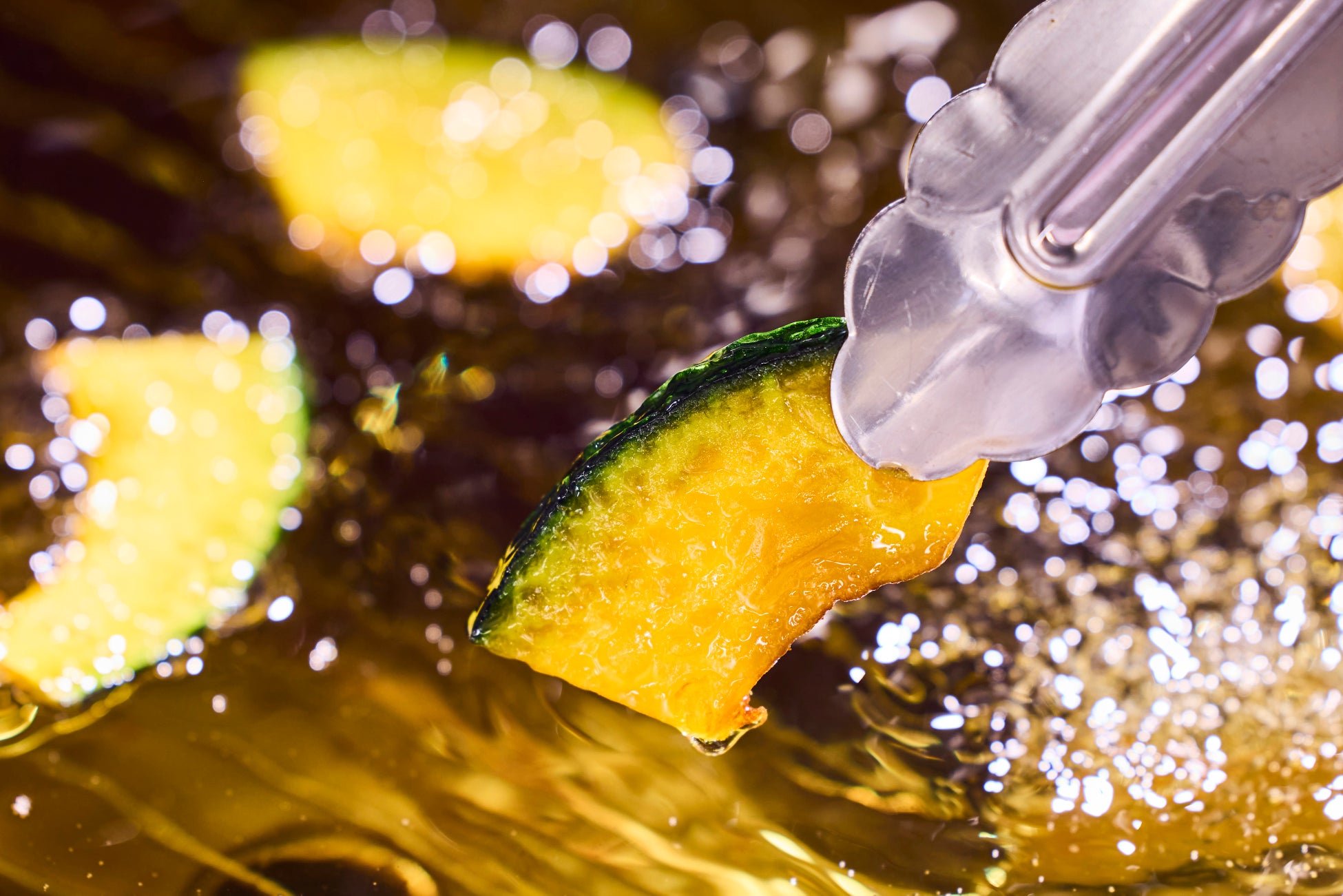 “ひと手間”かけた調理法で国産夏野菜の美味しさを引き出しました。トマトは鉄板でグリルする事で瑞々しさを残しながら甘みと旨みを凝縮。かぼちゃは素揚げし自然な甘さやホクホクとした食感を引き出しました。