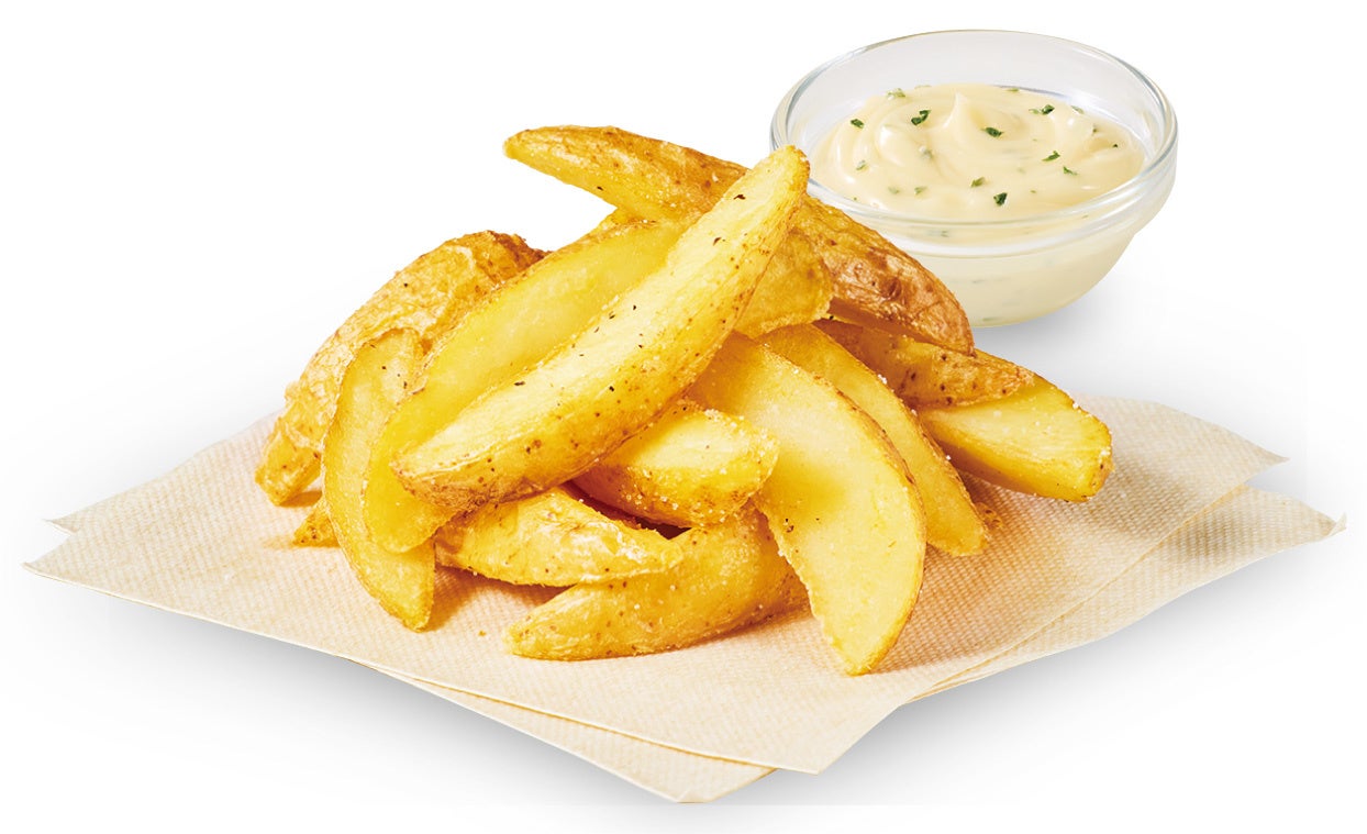 ご注文を受けてから作る揚げたてアツアツの北海道十勝産「北海こがね」の皮付きフライドポテトに、サワークリームの爽やかな酸味、バターミルクとチーズのコク、オニオンの旨みが詰まったシーズニングとマヨネーズを混ぜ合わせたソースをたっぷりとディップ。