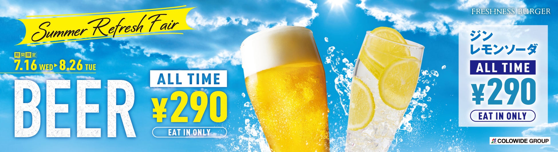 コロワイドグループの株式会社フレッシュネス(代表取締役社長:齋藤 健太朗/本社:神奈川県横浜市西区)は、2025年7月16日(水)より、ハンバーガーチェーン「フレッシュネスバーガー」にて、【サマーリフレッシュフェア】を開催。期間限定でビールと、自家製はちみつ漬けレモンスライスを使用したジンレモンソーダを終日1杯290円でご提供いたします。