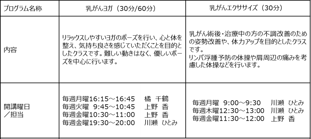 ●乳がんを経験された方や治療に取り組む方に向けた「乳がんヨガ」、「乳がんエクササイズ」プログラムの導入