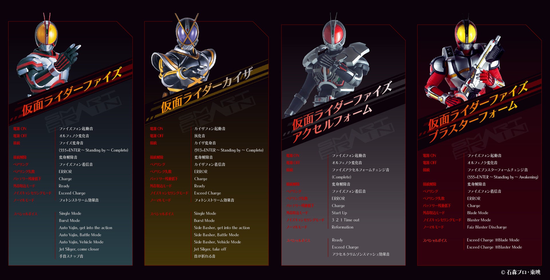 さらに、右ボタン長押しで発動する「スペシャルボイス」機能も搭載。ファイズ、ファイズアクセル、ファイズブラスター、カイザの4モードをアプリで切り替えることができます。