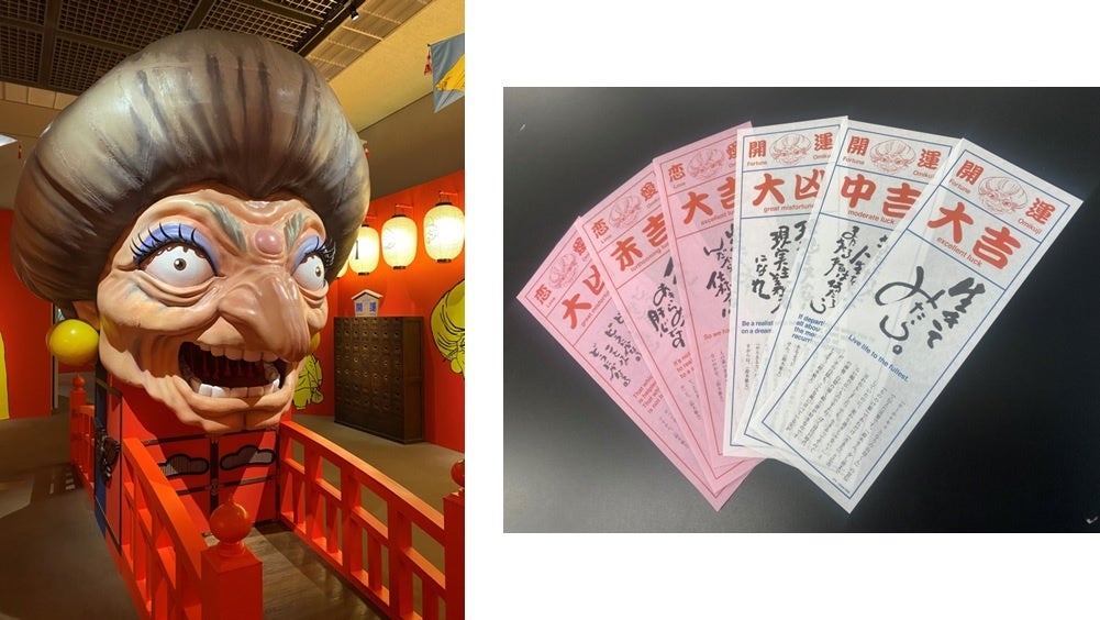 「湯婆婆と銭婆の“恋愛・開運”おみくじ」は高さ3mにも及ぶ湯婆婆と銭婆が圧巻。鈴木プロデューサーの言葉が様々なお悩みにアドバイスをしてくれる「おみくじコーナー」は迫力満点です。湯婆婆、銭婆の口に手をいれて番号を引くと、鈴木プロデューサーからの「大事な言葉」が印字されたおみくじがもらえます。