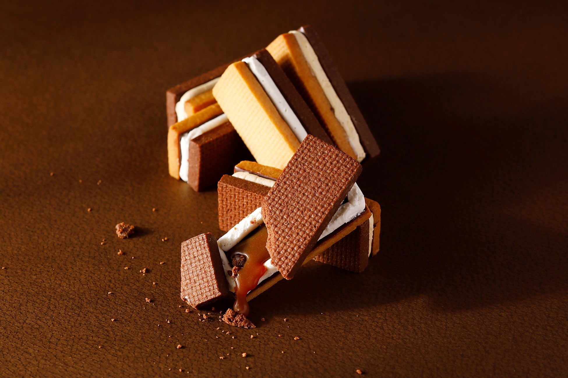 厚めに焼き上げたバニラとチョコレートのクッキー生地に、豆乳ベースのバニラとキャラメルクリームをサンドした2種類のフレーバーをお楽しみください。