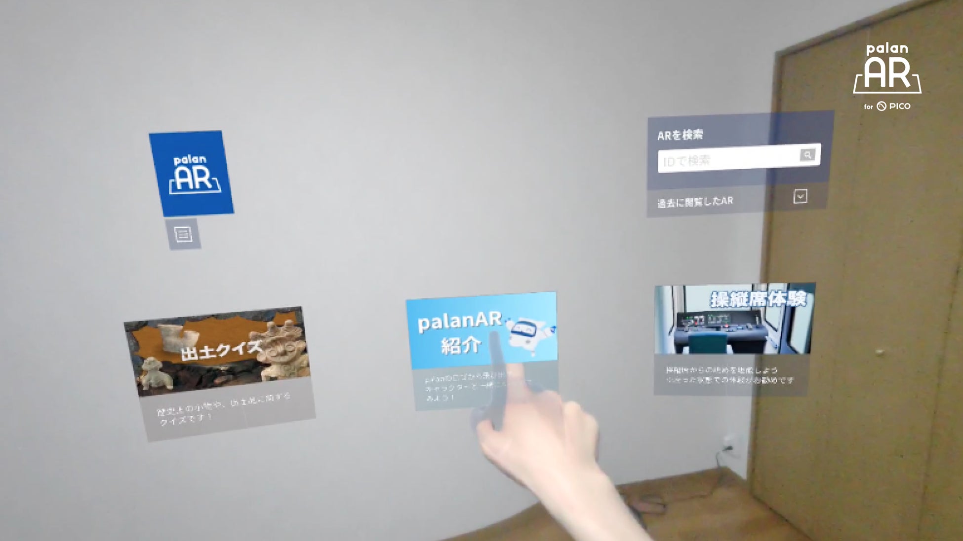 誰でも簡単にARを作れるサービス「palanAR」で制作したARを、 PICO 4で体験いただけます。パススルー機能を使用して、現実の世界とAR表示を組み合わせた体験が可能となります。