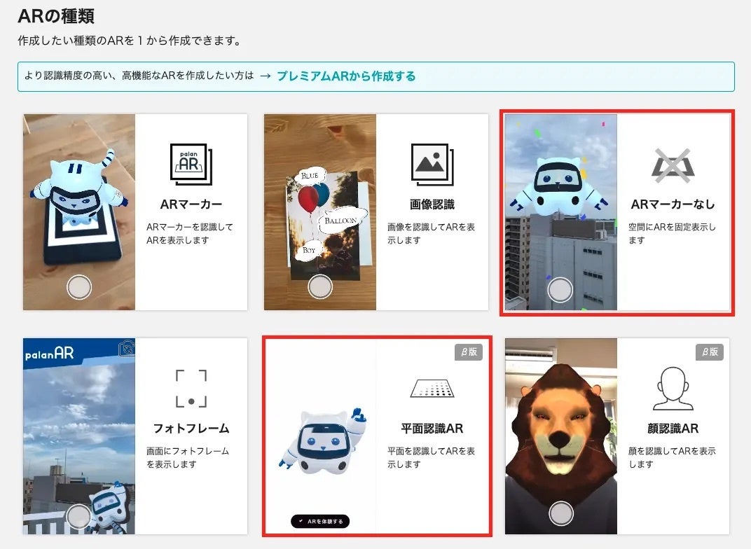 ①Webサービスの「palanAR」でARを作成します。対応しているプロジェクトは「ARマーカーなし」「平面認識」の2種類となります。