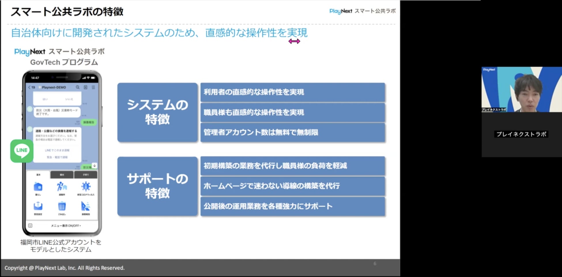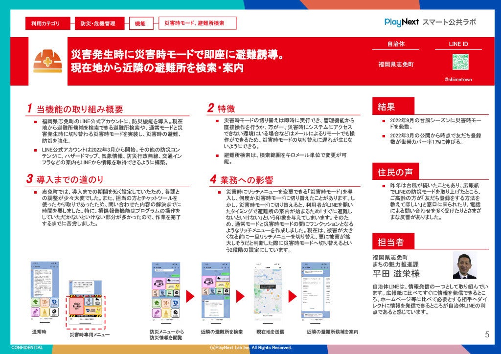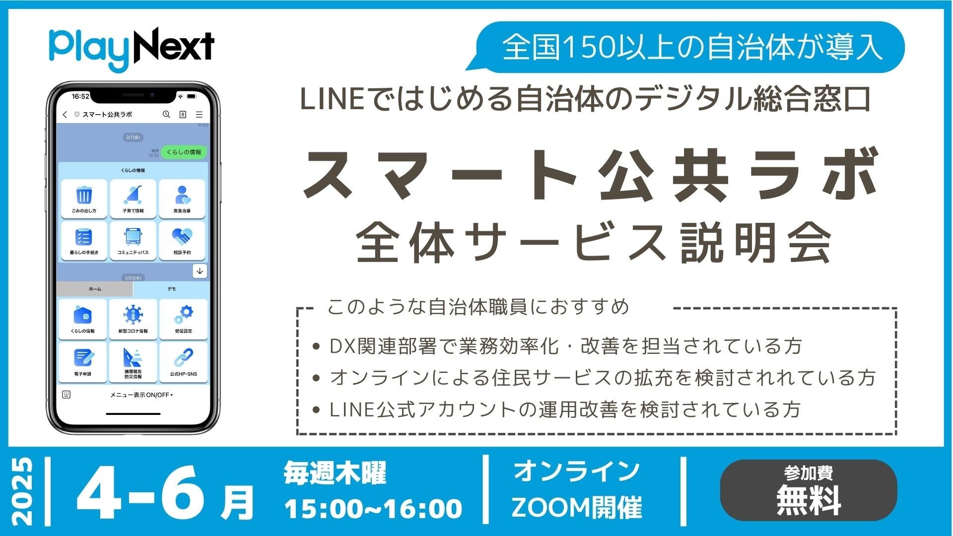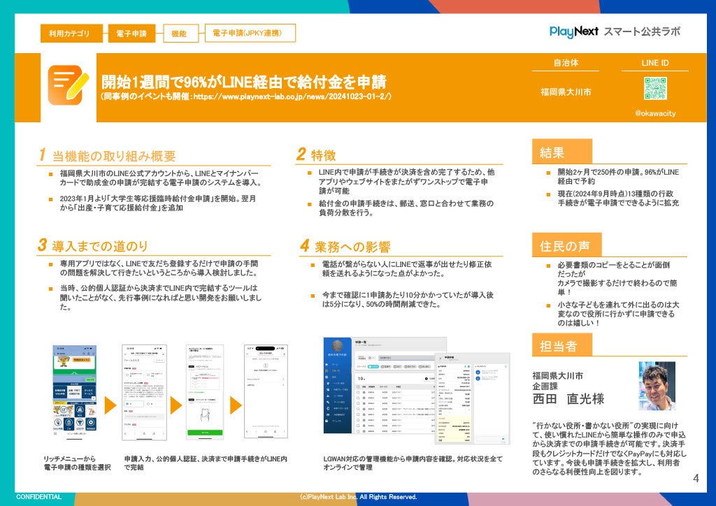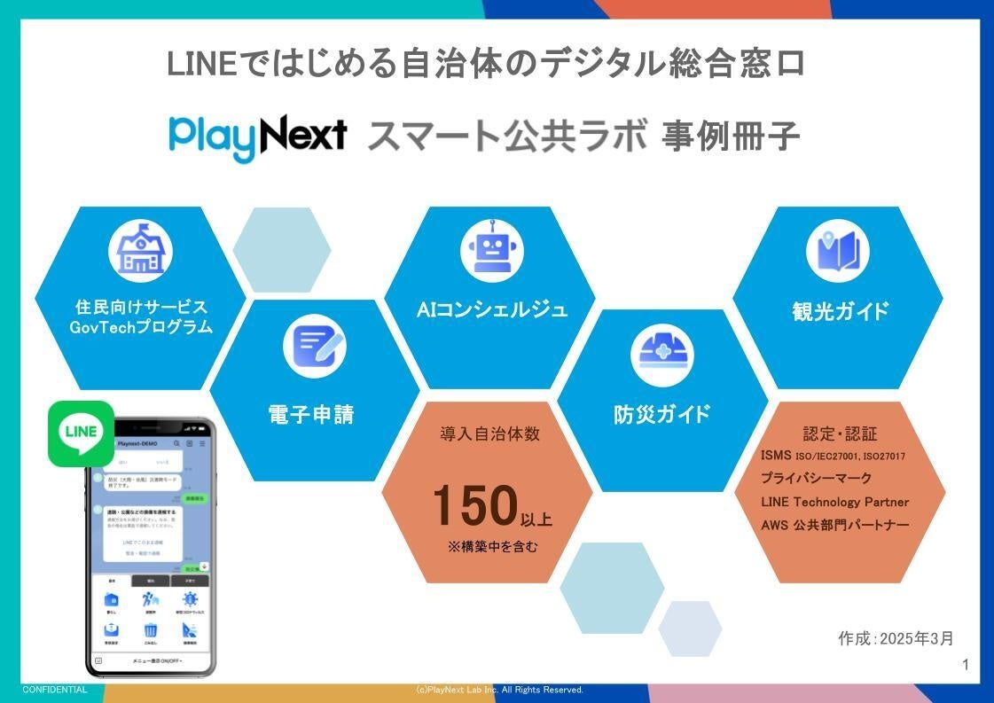 プレイネクストラボ株式会社(本社:東京都品川区、代表取締役:柏 匠)は、 全国150以上の自治体が導入するLINEではじめる自治体のデジタル総合窓口「スマート公共ラボ」のサービス全体の理解を深めていただくための「全体サービス説明会」を定期的に開催することをお知らせいたします。また、無料で配布している事例冊子をアップデートし、最新版を公開いたしました。